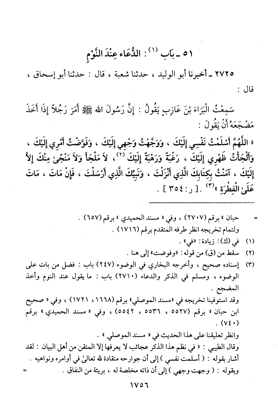 2725 - أَخْبَرَنَا أَبُو الْوَلِيدِ، حَدَّثَنَا شُعْبَةُ، قَالَ: حَدَّثَنَا أَبُو إِسْحَاقَ، قَالَ: سَمِعْتُ الْبَرَاءَ بْنَ عَازِبٍ، يَقُولُ: إِنَّ رَسُولَ اللَّهِ صَلَّى اللهُ عَلَيْهِ وَسَلَّمَ أَمَرَ رَجُلًا إِذَا أَخَذَ مَضْجَعَهُ أَنْ يَقُولَ: «§اللَّهُمَّ أَسْلَمْتُ نَفْسِي إِلَيْكَ، وَوَجَّهْتُ وَجْهِي إِلَيْكَ، وَفَوَّضْتُ أَمْرِي إِلَيْكَ، وَأَلْجَأْتُ ظَهْرِي إِلَيْكَ، رَغْبَةً وَرَهْبَةً إِلَيْكَ، لَا مَلْجَأَ وَلَا مَنْجَى مِنْكَ إِلَّا إِلَيْكَ، آمَنْتُ بِكِتَابِكَ الَّذِي أَنْزَلْتَ، وَنَبِيِّكَ الَّذِي أَرْسَلْتَ، فَإِنْ مَاتَ، مَاتَ عَلَى الْفِطْرَةِ» Qإسناده صحيح