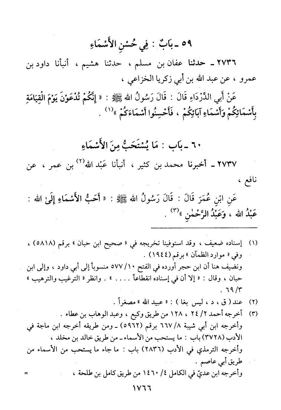 2737 - أَخْبَرَنَا مُحَمَّدُ بْنُ كَثِيرٍ، أَنْبَأَنَا عَبَيْدُ اللَّهِ بْنُ عُمَرَ، عَنْ نَافِعٍ، عَنْ ابْنِ عُمَرَ، قَالَ: قَالَ رَسُولُ اللَّهِ صَلَّى اللهُ عَلَيْهِ وَسَلَّمَ: " §أَحَبُّ الْأَسْمَاءِ إِلَى اللَّهِ: عَبْدُ اللَّهِ، وَعَبْدُ الرَّحْمَنِ "Qلم يحكم عليه المحقق