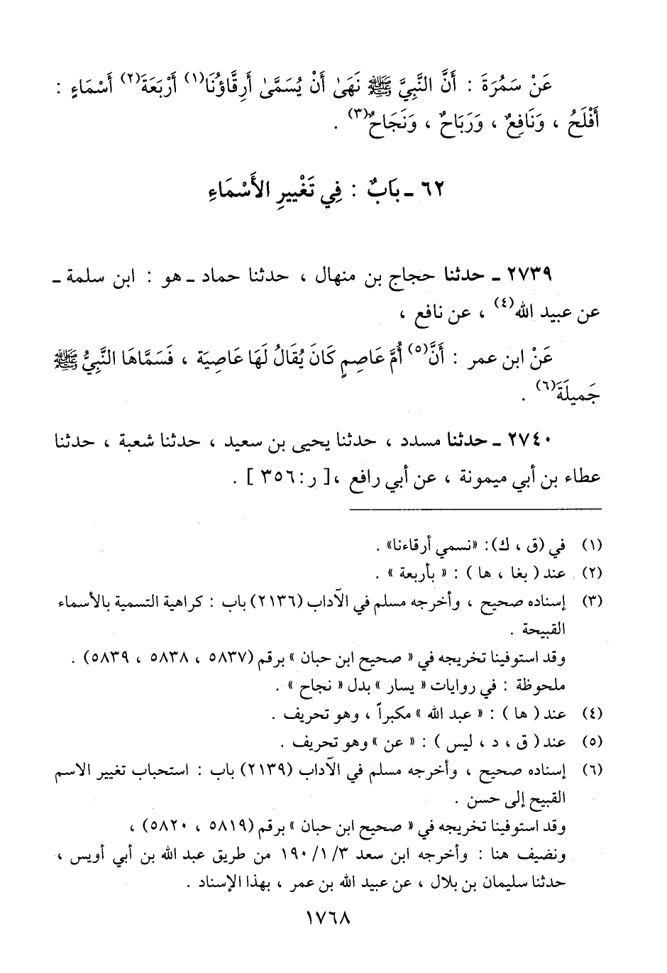 2739 - حَدَّثَنَا حَجَّاجُ بْنُ مِنْهَالٍ، حَدَّثَنَا حَمَّادٌ هُوَ ابْنُ سَلَمَةَ، عَنْ عُبَيْدِ اللَّهِ، عَنْ نَافِعٍ، عَنْ ابْنِ عُمَرَ: «أَنَّ §أُمَّ عَاصِمٍ كَانَ يُقَالُ لَهَا عَاصِيَةُ، فَسَمَّاهَا النَّبِيُّ صَلَّى اللهُ عَلَيْهِ وَسَلَّمَ جَمِيلَةَ» Qإسناده صحيح