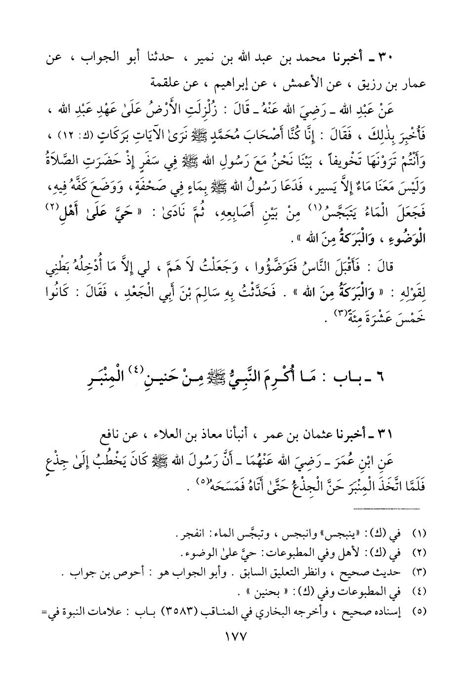 بَيْنَا نَحْنُ مَعَ رَسُولِ اللَّهِ صَلَّى اللَّهُ عَلَيْهِ وَسلَّمَ فِي سَفَرٍ إِذْ حَضَرَتِ الصَّلَاةُ وَلَيْسَ مَعَنَا مَاءٌ إِلَّا يَسِيرٌ، فَدَعَا رَسُولُ اللَّهِ صَلَّى اللَّهُ عَلَيْهِ وَسلَّمَ بِمَاءٍ فِي صَحْفَةٍ، «§وَوَضَعَ كَفَّهُ فِيهِ فَجَعَلَ الْمَاءُ يَنْبَجِسُ مِنْ بَيْنِ أَصَابِعِهِ»، ثُمَّ نَادَى: «حَيَّ عَلَى أَهْلِ الْوُضُوءِ، وَالْبَرَكَةِ مِنَ اللَّهِ» قَالَ: فَأَقْبَلَ النَّاسُ فَتَوَضَّئُوا، وَجَعَلتُ لَا هَمَّ لِي إِلَّا مَا أُدْخِلُهُ بَطْنِي لِقَوْلِهِ: «وَالْبَرَكَةِ مِنَ اللَّهِ». فحدَّثْتُ بِهِ سالمَ بْنَ أَبِي الْجَعْدِ فَقَالَ: كَانُوا خَمْسَ عَشْرَةَ مِائَةً