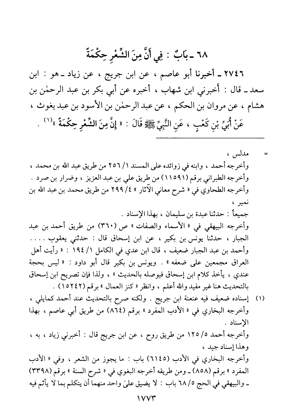 2746 - أَخْبَرَنَا أَبُو عَاصِمٍ، عَنْ ابْنِ جُرَيْجٍ، عَنْ زِيَادٍ هُوَ ابْنُ سَعْدٍ، قَالَ: أَخْبَرَنِي أَنَّ ابْنَ شِهَابٍ، أَخْبَرَهُ عَنْ أَبِي بَكْرِ بْنِ عَبْدِ الرَّحْمَنِ بْنِ هِشَامٍ، عَنْ مَرْوَانَ بْنِ الْحَكَمِ، عَنْ عَبْدِ الرَّحْمَنِ بْنِ الْأَسْوَدِ بْنِ عَبْدِ يَغُوثَ، عَنْ أُبَيِّ بْنِ كَعْبٍ، عَنِ النَّبِيِّ صَلَّى اللهُ عَلَيْهِ وَسَلَّمَ قَالَ: «§إِنَّ مِنَ الشِّعْرِ حِكْمَةً» Qإسناده ضعيف فيه عنعنة ابن جريج. ولكنه صرح بالتحديث عند أحمد