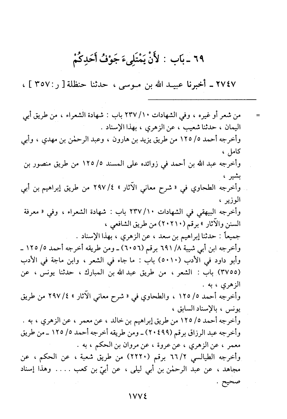 2747 - أَخْبَرَنَا عُبَيْدُ اللَّهِ بْنُ مُوسَى، حَدَّثَنَا حَنْظَلَةُ، -[1775]- عَنْ سَالِمٍ، عَنْ ابْنِ عُمَرَ، قَالَ: قَالَ رَسُولُ اللَّهِ صَلَّى اللهُ عَلَيْهِ وَسَلَّمَ: «§لَأَنْ يَمْتَلِئَ جَوْفُ أَحَدِكُمْ قَيْحًا أَوْ دَمًا خَيْرٌ لَهُ مِنْ أَنْ يَمْتَلِئَ شِعْرًا» Qإسناده صحيح
