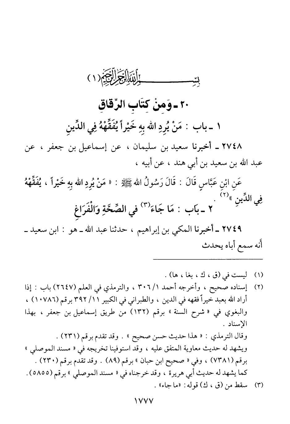 2748 - أَخْبَرَنَا سَعِيدُ بْنُ سُلَيْمَانَ، عَنْ إِسْمَاعِيلَ بْنِ جَعْفَرٍ، عَنْ عَبْدِ اللَّهِ بْنِ سَعِيدِ بْنِ أَبِي هِنْدٍ، عَنْ أَبِيهِ، عَنْ ابْنِ عَبَّاسٍ، قَالَ: قَالَ رَسُولُ اللَّهِ صَلَّى اللهُ عَلَيْهِ وَسَلَّمَ: «§مَنْ يُرِدِ اللَّهُ بِهِ خَيْرًا، يُفَقِّهْهُ فِي الدِّينِ» Qإسناده صحيح