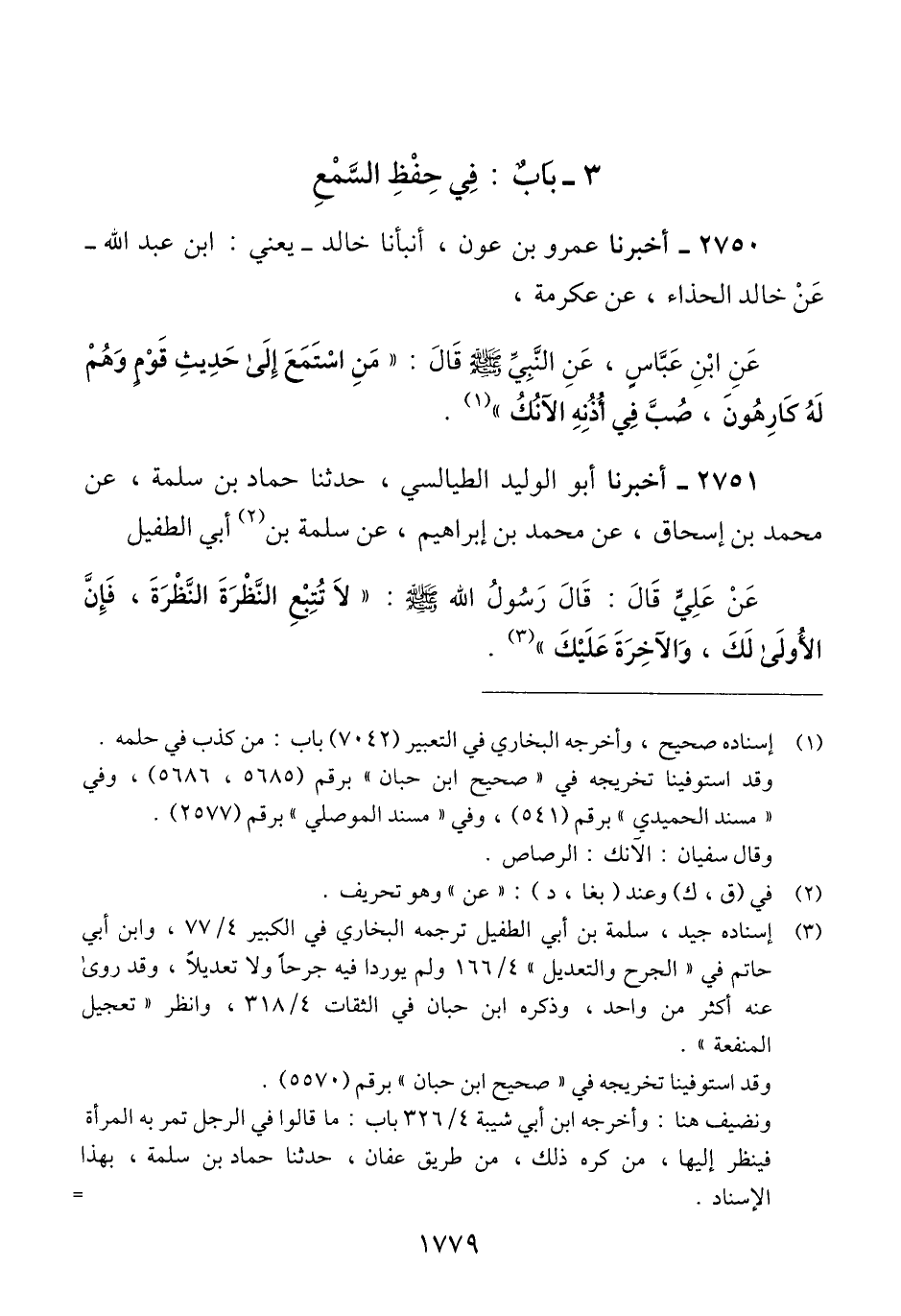 2751 - أَخْبَرَنَا أَبُو الْوَلِيدِ الطَّيَالِسِيُّ، حَدَّثَنَا حَمَّادُ بْنُ سَلَمَةَ، عَنْ مُحَمَّدِ بْنِ إِسْحَاقَ، عَنْ مُحَمَّدِ بْنِ إِبْرَاهِيمَ، عَنْ سَلَمَةَ بْنِ أَبِي الطُّفَيْلِ، عَنْ عَلِيٍّ، قَالَ: قَالَ رَسُولُ اللَّهِ صَلَّى اللهُ عَلَيْهِ وَسَلَّمَ: «§لَا تُتْبِعِ النَّظْرَةَ النَّظْرَةَ، فَإِنَّ الْأُولَى لَكَ، وَالْآخِرَةَ عَلَيْكَ» Qإسناده جيد