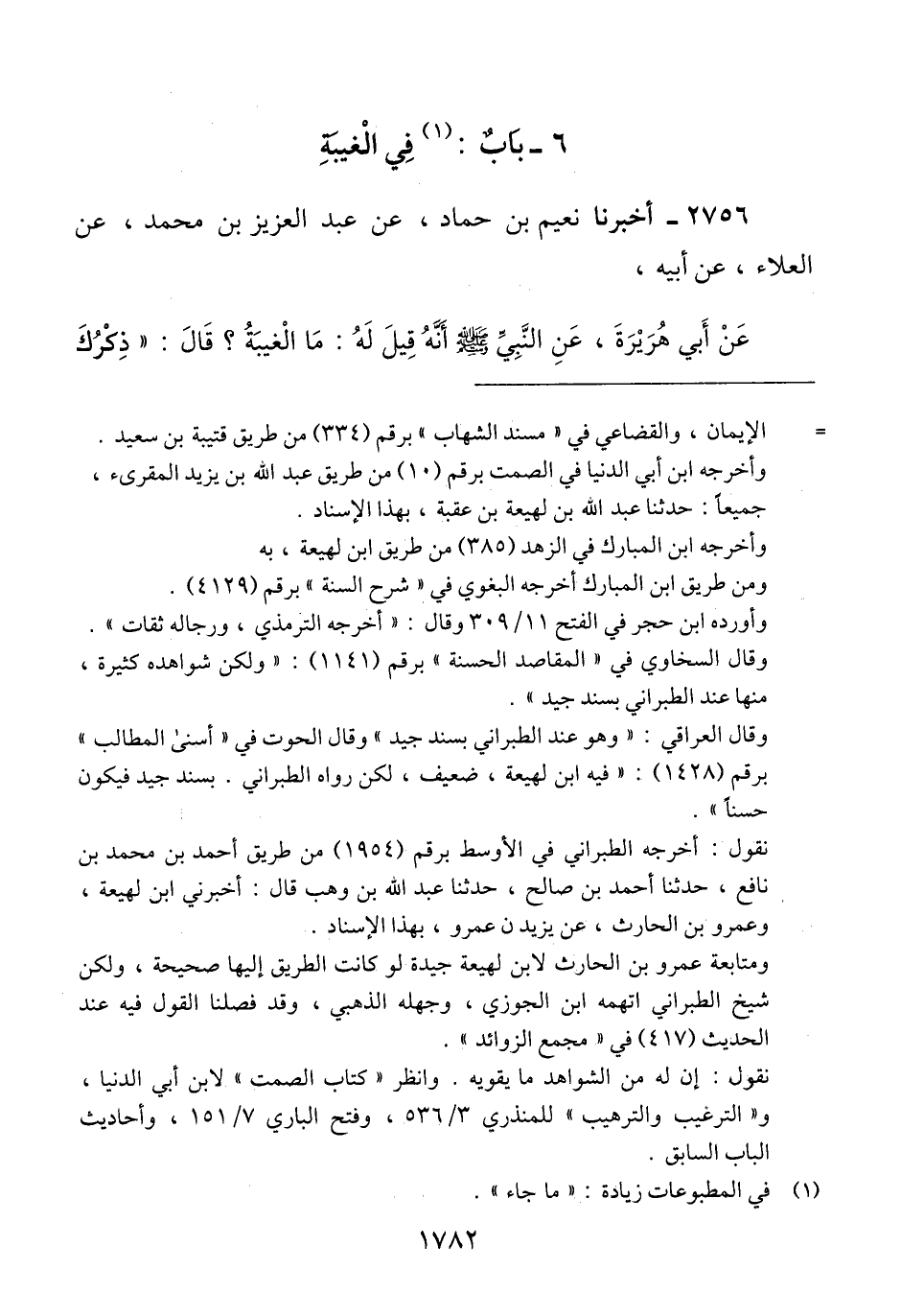 2756 - أَخْبَرَنَا نُعَيْمُ بْنُ حَمَّادٍ، عَنْ عَبْدِ الْعَزِيزِ بْنِ مُحَمَّدٍ، عَنْ الْعَلَاءِ، عَنْ أَبِيهِ، عَنْ أَبِي هُرَيْرَةَ، عَنِ النَّبِيِّ صَلَّى اللهُ عَلَيْهِ وَسَلَّمَ أَنَّهُ قِيلَ لَهُ: مَا الْغِيبَةُ؟ قَالَ: «§ذِكْرُكَ -[1783]- أَخَاكَ بِمَا يَكْرَهُ». قِيلَ: وَإِنْ كَانَ فِي أَخِي مَا أَقُولُ؟ قَالَ: «فَإِنْ كَانَ فِيهِ، فَقَدِ اغْتَبْتَهُ، وَإِنْ لَمْ يَكُنْ فِيهِ، فَقَدْ بَهَتَّهُ» Qإسناده حسن