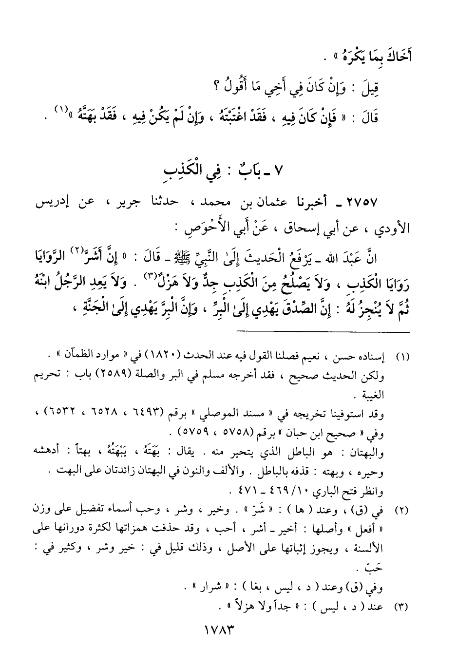 2757 - أَخْبَرَنَا عُثْمَانُ بْنُ مُحَمَّدٍ، حَدَّثَنَا جَرِيرٌ، عَنْ إِدْرِيسَ الْأَوْدِيِّ، عَنْ أَبِي إِسْحَقَ، عَنْ أَبِي الْأَحْوَصِ، أَنَّ عَبْدَ اللَّهِ - يَرْفَعُ الْحَدِيثَ إِلَى النَّبِيِّ صَلَّى اللهُ عَلَيْهِ وَسَلَّمَ - قَالَ: " §إِنَّ شَرَّ الرَّوَايَا رَوَايَا الْكَذِبِ، وَلَا يَصْلُحُ مِنَ الْكَذِبِ جِدٌّ وَلَا هَزْلٌ، وَلَا يَعِدُ الرَّجُلُ ابْنَهُ ثُمَّ لَا يُنْجِزُ لَهُ: إِنَّ الصِّدْقَ يَهْدِي إِلَى الْبِرِّ، وَإِنَّ الْبِرَّ يَهْدِي إِلَى الْجَنَّةِ، -[1784]- وَإِنَّ الْكَذِبَ يَهْدِي إِلَى الْفُجُورِ، وَإِنَّ الْفُجُورَ يَهْدِي إِلَى النَّارِ، وَإِنَّهُ يُقَالُ لِلصَّادِقِ: صَدَقَ وَبَرَّ، وَيُقَالُ لِلْكَاذِبِ: كَذَبَ وَفَجَرَ، وَإِنَّ الرَّجُلَ لَيَصْدُقُ حَتَّى يُكْتَبَ عِنْدَ اللَّهِ صِدِّيقًا، وَيَكْذِبُ حَتَّى يُكْتَبَ عِنْدَ اللَّهِ كَذَّابًا "Qإسناده صحيح وجرير هو: ابن عبد الحميد وإدريس هو ابن يزيد الأودي
