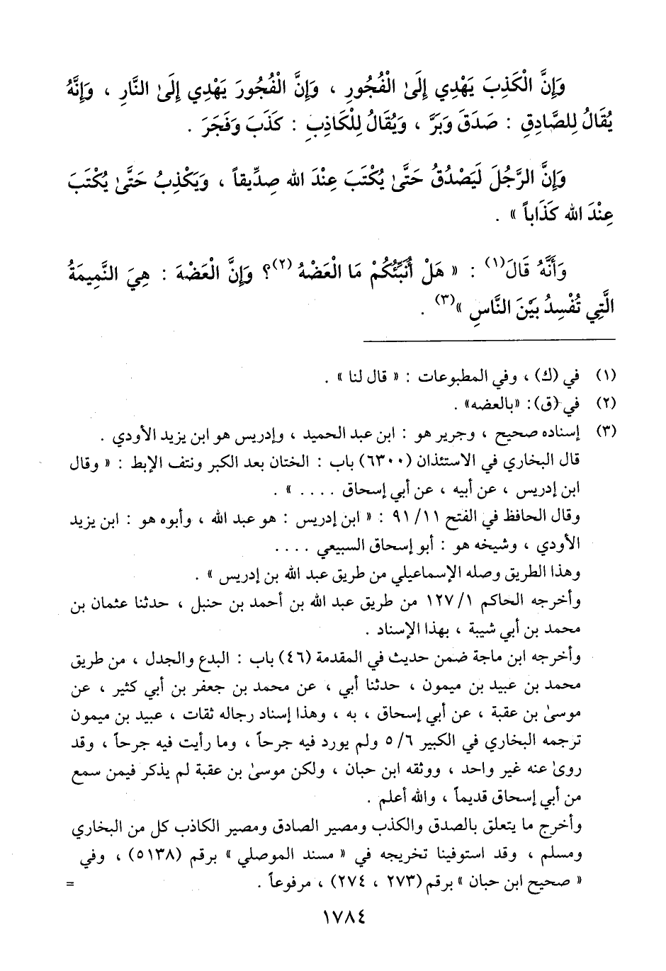 وَإِنَّهُ قَالَ لَنَا: " §هَلْ أُنَبِّئُكُمْ مَا الْعَضْهُ؟ وَإِنَّ الْعَضْهَ: هِيَ النَّمِيمَةُ الَّتِي تُفْسِدُ بَيْنَ النَّاسِ "