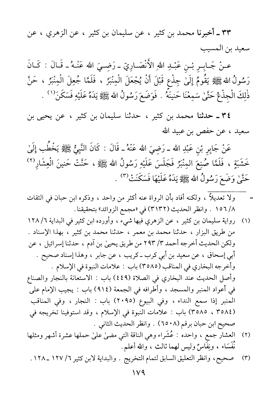 33 - أَخْبَرَنَا مُحَمَّدُ بْنُ كَثِيرٍ، عَنْ سُلَيْمَانَ بْنِ كَثِيرٍ، عَنِ الزُّهْرِيِّ، عَنْ سَعِيدِ بْنِ الْمُسَيِّبِ، عَنْ جَابِرِ بْنِ عَبْدِ اللَّهِ الْأَنْصَارِيِّ رَضِيَ اللَّهُ عَنْهُ، قَالَ: «كَانَ رَسُولُ اللَّهِ صَلَّى اللهُ عَلَيْهِ وَسَلَّمَ يَقُومُ إِلَى جِذْعٍ قَبْلَ أَنْ يُجْعَلَ الْمِنْبَرُ، فَلَمَّا جُعِلَ الْمِنْبَرُ، §حَنَّ ذَلِكَ الْجِذْعُ حَتَّى سَمِعْنَا حَنِينَهُ فَوَضَعَ رَسُولُ اللَّهِ صَلَّى اللهُ عَلَيْهِ وَسَلَّمَ يَدَهُ عَلَيْهِ فَسَكَنَ» Qلم يحكم عليه المحقق