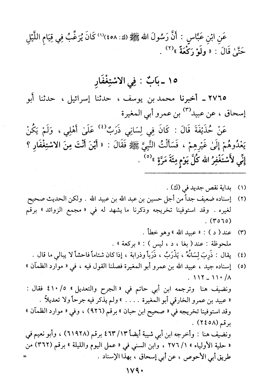 2765 - أَخْبَرَنَا مُحَمَّدُ بْنُ يُوسُفَ، حَدَّثَنَا إِسْرَائِيلُ، حَدَّثَنَا أَبُو إِسْحَاقَ، عَنْ عُبَيْدِ بْنِ عَمْرٍو أَبِي الْمُغِيرَةِ، عَنْ حُذَيْفَةَ، قَالَ: كَانَ فِي لِسَانِي ذَرَبٌ عَلَى أَهْلِي، وَلَمْ يَكُنْ يَعْدوُهُمْ إِلَى غَيْرِهِمْ، فَسَأَلْتُ النَّبِيَّ صَلَّى اللهُ عَلَيْهِ وَسَلَّمَ فَقَالَ: «§أَيْنَ أَنْتَ مِنَ الِاسْتِغْفَارِ؟ إِنِّي لَأَسْتَغْفِرُ اللَّهَ كُلَّ يَوْمٍ مِائَةَ مَرَّةٍ» Qإسناده جيد