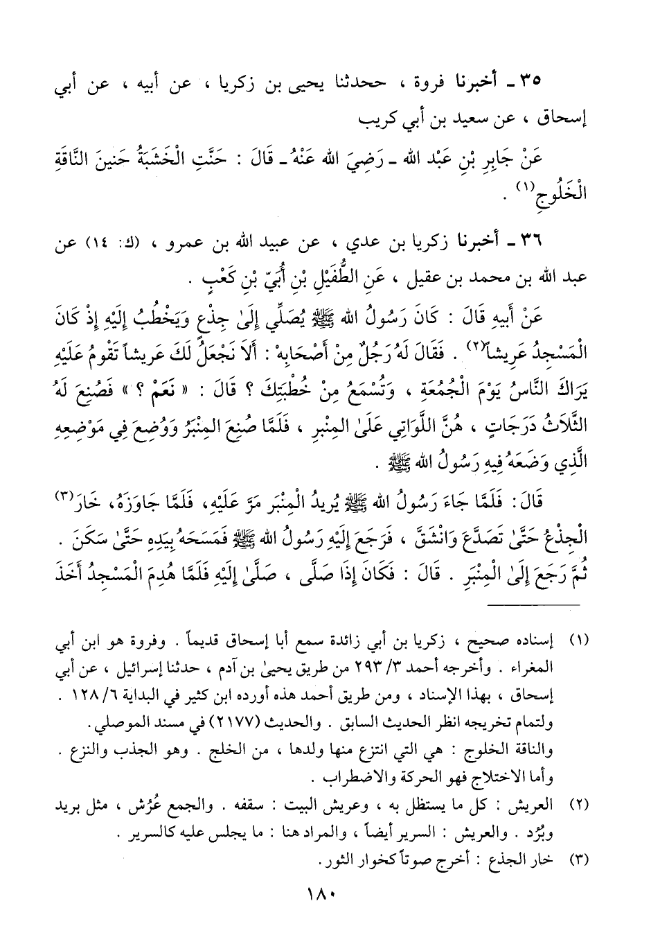 35 - أَخْبَرَنَا فَرْوَةُ، حَدَّثَنَا يَحْيَى بْنُ زَكَرِيَّا، عَنْ أَبِيهِ، عَنْ أَبِي إِسْحَاقَ، عَنْ سَعِيدِ بْنِ أَبِي كَرِبٍ، عَنْ جَابِرِ بْنِ عَبْدِ اللَّهِ رَضِيَ اللَّهُ عَنْهُ، قَالَ: «§حَنَّتِ الْخَشَبَةُ حَنِينَ النَّاقَةِ الْخَلُوجِ» Qإسناده صحيح