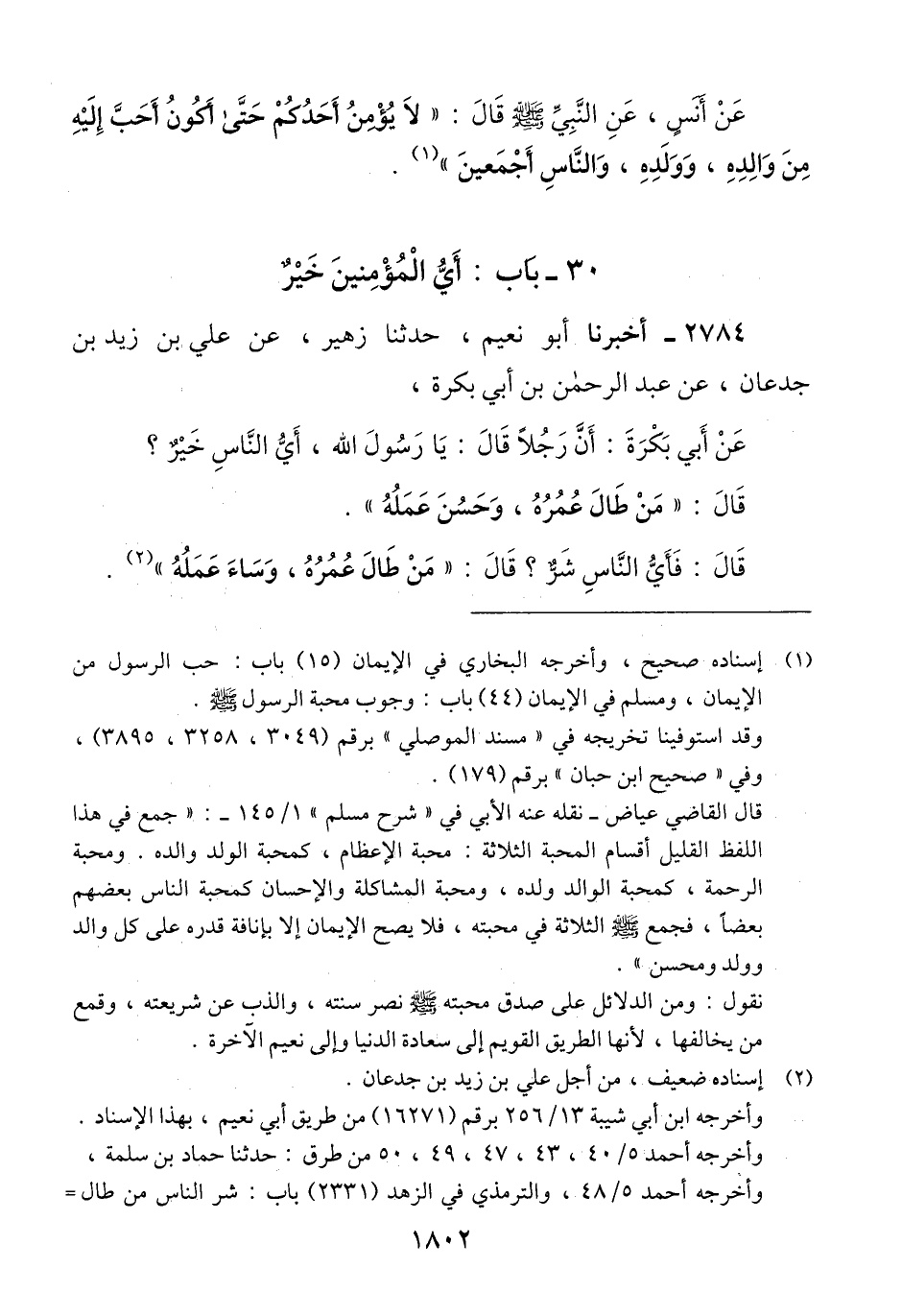 2784 - أَخْبَرَنَا أَبُو نُعَيْمٍ، حَدَّثَنَا زُهَيْرٌ، عَنْ عَلِيِّ بْنِ زَيْدِ بْنِ جُدْعَانَ، عَنْ عَبْدِ الرَّحْمَنِ بْنِ أَبِي بَكْرَةَ، عَنْ أَبِي بَكْرَةَ، أَنَّ رَجُلًا قَالَ: يَا رَسُولَ اللَّهِ، أَيُّ النَّاسِ خَيْرٌ؟ قَالَ: «§مَنْ طَالَ عُمُرُهُ، وَحَسُنَ عَمَلُهُ» قَالَ: فَأَيُّ النَّاسِ شَرٌّ؟ قَالَ: «مَنْ طَالَ عُمُرُهُ، وَسَاءَ عَمَلُهُ» Qإسناده ضعيف