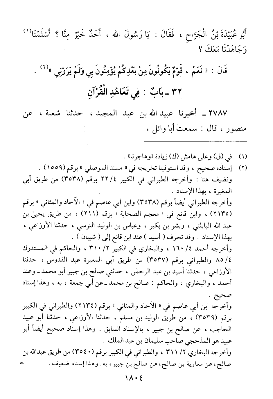 2787 - أَخْبَرَنَا عُبَيْدُ اللَّهِ بْنُ عَبْدِ الْمَجِيدِ، حَدَّثَنَا شُعْبَةُ، عَنْ مَنْصُورٍ، قَالَ: سَمِعْتُ أَبَا وَائِلٍ، -[1805]- عَنْ عَبْدِ اللَّهِ، عَنِ النَّبِيِّ صَلَّى اللهُ عَلَيْهِ وَسَلَّمَ قَالَ: " §بِئْسَمَا لِأَحَدِكُمْ أَنْ يَقُولَ: نَسِيتُ آيَةَ كَيْتَ وَكَيْتَ، بَلْ هُوَ نُسِّيَ، فَاسْتَذْكِرُوا الْقُرْآنَ، فَإِنَّهُ أَسْرَعُ تَفَصِّيًا مِنْ صُدُورِ الرِّجَالِ مِنَ النَّعَمِ مِنْ عُقُلِهَا "Qإسناده صحيح