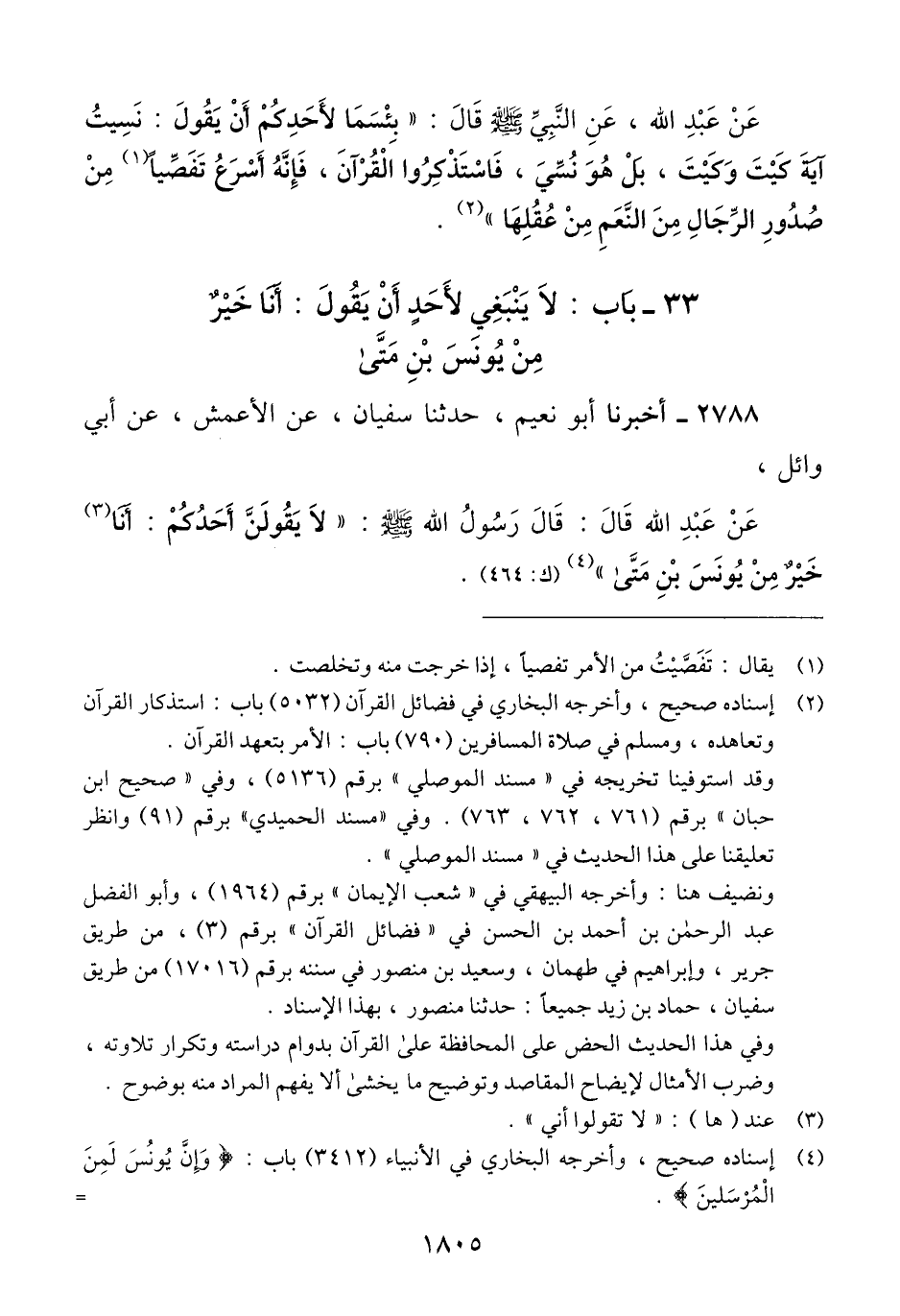 2788 - أَخْبَرَنَا أَبُو نُعْيَمٍ، حَدَّثَنَا سُفْيَانُ، عَنْ الْأَعْمَشِ، عَنْ أَبِي وَائِلٍ، عَنْ عَبْدِ اللَّهِ، قَالَ: قَالَ رَسُولُ اللَّهِ صَلَّى اللهُ عَلَيْهِ وَسَلَّمَ: " §لَا يَقُولَنَّ أَحَدُكُمْ: أَنَا خَيْرٌ مِنْ يُونُسَ بْنِ مَتَّى "Qإسناده صحيح