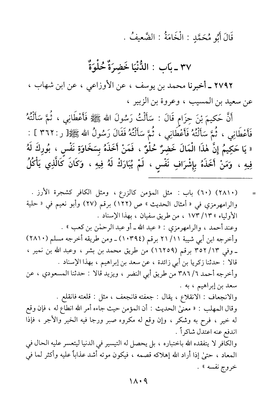 2792 - أَخْبَرَنَا مُحَمَّدُ بْنُ يُوسُفَ، عَنْ الْأَوْزَاعِيِّ، عَنْ ابْنِ شِهَابٍ، عَنْ سَعِيدِ بْنِ الْمُسَيِّبِ، وَعُرْوَةَ بْنِ الزُّبَيْرِ، أَنَّ حَكِيمَ بْنَ حِزَامٍ، قَالَ: سَأَلْتُ رَسُولَ اللَّهِ صَلَّى اللهُ عَلَيْهِ وَسَلَّمَ فَأَعْطَانِي، ثُمَّ سَأَلْتُهُ فَأَعْطَانِي، ثُمَّ سَأَلْتُهُ فَأَعْطَانِي، ثُمَّ سَأَلْتُهُ فَقَالَ رَسُولُ اللَّهِ صَلَّى اللهُ عَلَيْهِ وَسَلَّمَ: «يَا حَكِيمُ §إِنَّ هَذَا الْمَالَ خَضِرٌ حُلْوٌ، فَمَنْ أَخَذَهُ بِسَخَاوَةِ نَفْسٍ، بُورِكَ لَهُ فِيهِ، وَمَنْ أَخَذَهُ بِإِشْرَافِ نَفْسٍ، لَمْ يُبَارَكْ لَهُ فِيهِ، وَكَانَ كَالَّذِي يَأْكُلُ -[1810]- وَلَا يَشْبَعُ، وَالْيَدُ الْعُلْيَا خَيْرٌ مِنَ الْيَدِ السُّفْلَى» Qإسناده صحيح