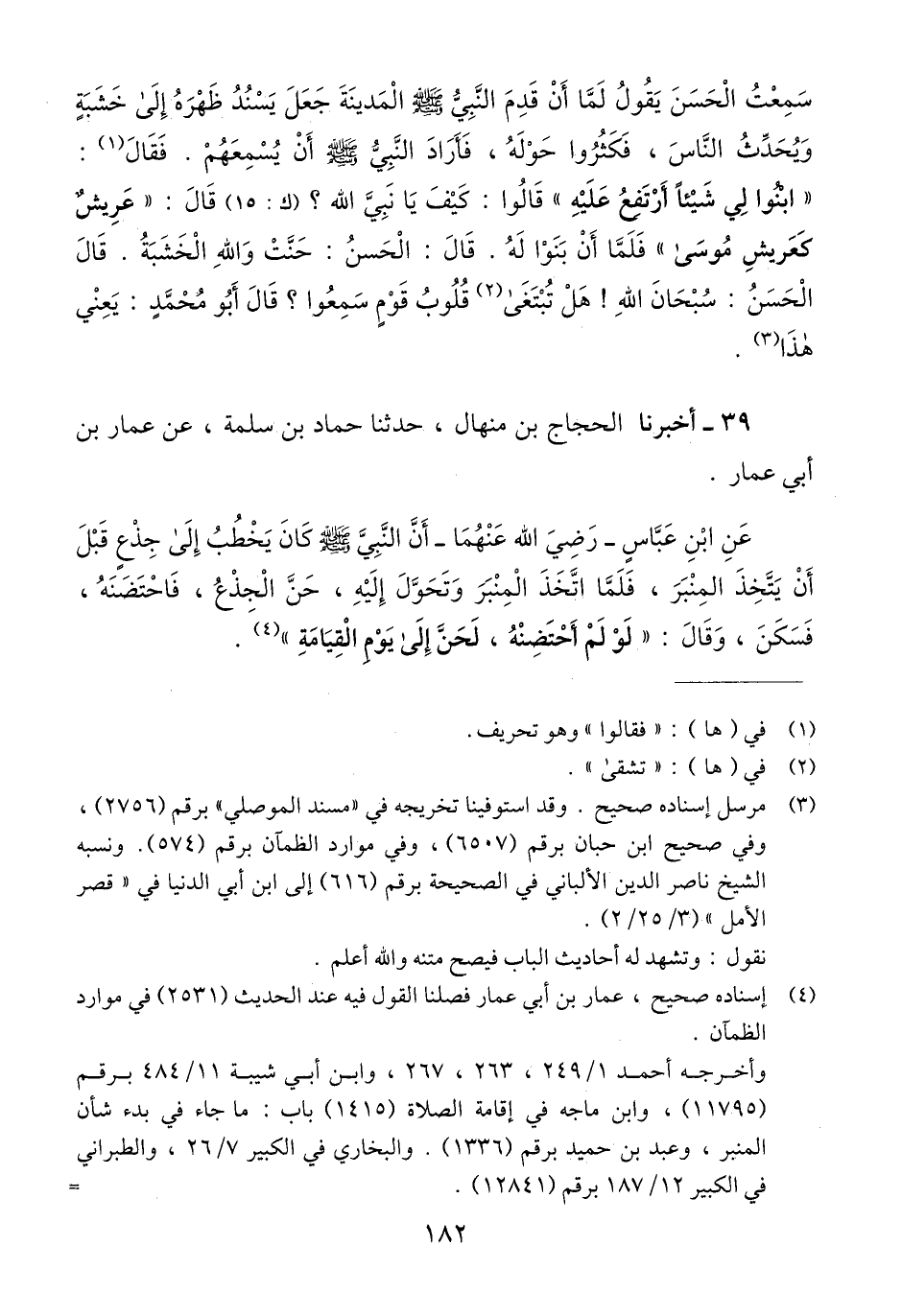 39 - أَخْبَرَنَا الْحَجَّاجُ بْنُ مِنْهَالٍ، حَدَّثَنَا حَمَّادُ بْنُ سَلَمَةَ، عَنْ عَمَّارِ بْنِ أَبِي عَمَّارٍ، عَنِ ابْنِ عَبَّاسٍ رَضِيَ اللَّهُ عَنْهُمَا، أَنَّ النَّبِيَّ صَلَّى اللهُ عَلَيْهِ وَسَلَّمَ كَانَ يَخْطُبُ إِلَى جِذْعٍ قَبْلَ أَنْ يَتَّخِذَ الْمِنْبَرَ، فَلَمَّا اتَّخَذَ الْمِنْبَرَ وَتَحَوَّلَ إِلَيْهِ، حَنَّ الْجِذْعُ فَاحْتَضَنَهُ، فَسَكَنَ، وَقَالَ: «§لَوْ لَمْ أَحْتَضِنْهُ، لَحَنَّ إِلَى يَوْمِ الْقِيَامَةِ» Qإسناده صحيح