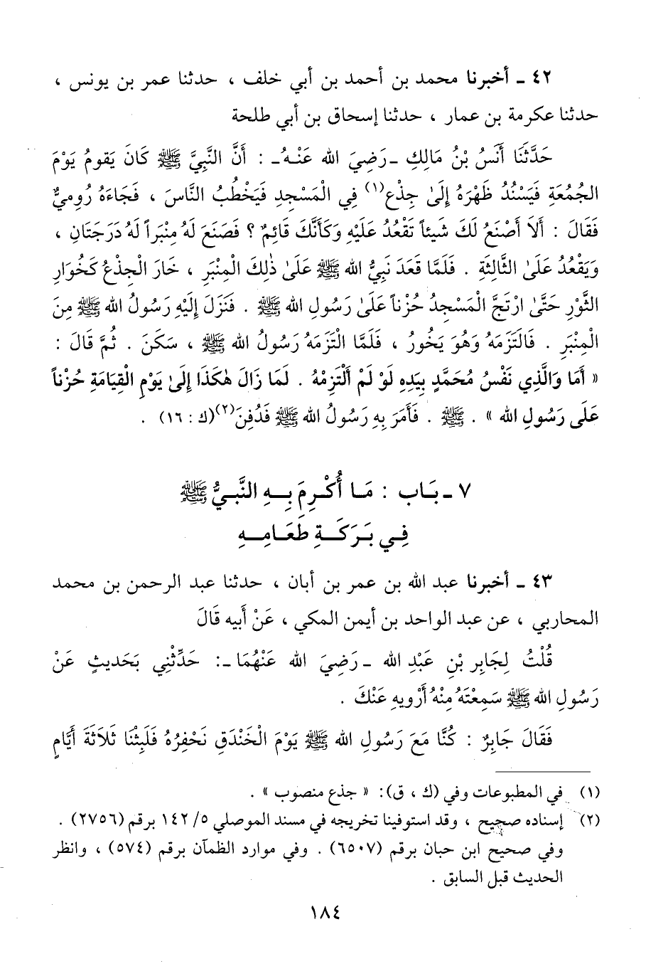 42 - أَخْبَرَنَا مُحَمَّدُ بْنُ أَحْمَدَ بْنِ أَبِي خَلَفٍ، حَدَّثَنَا عُمَرُ بْنُ يُونُسَ، حَدَّثَنَا عِكْرِمَةُ بْنُ عَمَّارٍ، حَدَّثَنَا إِسْحَاقُ بْنُ أَبِي طَلْحَةَ، حَدَّثَنَا أَنَسُ بْنُ مَالِكٍ رَضِيَ اللَّهُ عَنْهُ أَنَّ النَّبِيَّ صَلَّى اللهُ عَلَيْهِ وَسَلَّمَ كَانَ يَقُومُ يَوْمَ الْجُمُعَةِ فَيُسْنِدُ ظَهْرَهُ إِلَى جِذْعٍ فِي الْمَسْجِدِ فَيَخْطُبُ النَّاسَ، فَجَاءَهُ رُومِيٌّ، فَقَالَ: أَلَا أَصْنَعُ لَكَ شَيْئًا تَقْعُدُ عَلَيْهِ وَكَأَنَّكَ قَائِمٌ؟ فَصَنَعَ لَهُ مِنْبَرًا لَهُ دَرَجَتَانِ، وَيَقْعُدُ عَلَى الثَّالِثَةِ، فَلَمَّا قَعَدَ نَبِيُّ اللَّهُ صَلَّى اللهُ عَلَيْهِ وَسَلَّمَ عَلَى ذَلِكَ الْمِنْبَرِ، خَارَ الْجِذْعُ كَخُوَارِ الثَّوْرِ حَتَّى ارْتَجَّ الْمَسْجِدُ حُزْنًا عَلَى رَسُولِ اللَّهِ صَلَّى اللهُ عَلَيْهِ وَسَلَّمَ، فَنَزَلَ إِلَيْهِ رَسُولُ اللَّهِ صَلَّى اللهُ عَلَيْهِ وَسَلَّمَ مِنَ الْمِنْبَرِ، فَالْتَزَمَهُ وَهُوَ يَخُورُ , فَلَمَّا الْتَزَمَهُ رَسُولُ اللَّهِ صَلَّى اللهُ عَلَيْهِ وَسَلَّمَ، سَكَنَ، ثُمَّ قَالَ: «§أَمَا وَالَّذِي نَفْسُ مُحَمَّدٍ بِيَدِهِ لَوْ لَمْ أَلْتَزِمْهُ، لَمَا زَالَ هَكَذَا إِلَى يَوْمِ الْقِيَامَةِ حُزْنًا عَلَى رَسُولِ اللَّهِ صَلَّى اللهُ عَلَيْهِ وَسَلَّمَ»، فَأَمَرَ بِهِ رَسُولُ اللَّهِ صَلَّى اللهُ عَلَيْهِ وَسَلَّمَ فَدُفِنَQإسناده صحيح