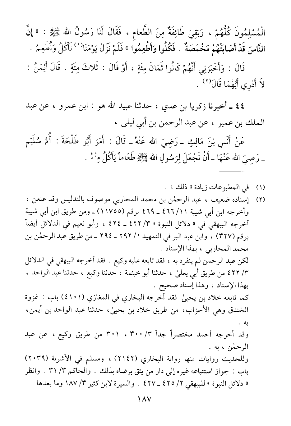 44 - قَالَ أَخْبَرَنَا زَكَرِيَّا بْنُ عَدِيٍّ، حَدَّثَنَا عُبَيْدُ اللَّهِ هُوَ ابْنُ عَمْرٍو، عَنْ عَبْدِ الْمَلِكِ بْنِ عُمَيْرٍ، عَنْ عَبْدِ الرَّحْمَنِ بْنِ أَبِي لَيْلَى، عَنْ أَنَسِ بْنِ مَالِكٍ رَضِيَ اللَّهُ عَنْهُ، قَالَ: أَمَرَ أَبُو طَلْحَةَ أُمَّ سُلَيْمٍ رَضِيَ اللَّهُ عَنْهَا أَنْ تَجْعَلَ لِرَسُولِ اللَّهِ صَلَّى اللهُ عَلَيْهِ وَسَلَّمَ طَعَامًا يَأْكُلُ مِنْهُ، -[188]- قَالَ: ثُمَّ بَعَثَنِي أَبُو طَلْحَةَ إِلَى رَسُولِ اللَّهِ صَلَّى اللهُ عَلَيْهِ وَسَلَّمَ فَأَتَيْتُهُ فَقُلْتُ: بَعَثَنِي إِلَيْكَ أَبُو طَلْحَةَ، فَقَالَ لِلْقَوْمِ: «قُومُوا» فَانْطَلَقَ وَانْطَلَقَ الْقَوْمُ مَعَهُ، فَقَالَ أَبُو طَلْحَةَ: يَا رَسُولَ اللَّهِ، إِنَّمَا صَنَعْتُ طَعَامًا لِنَفْسِكَ خَاصَّةً؟، فَقَالَ: «لَا عَلَيْكَ انْطَلِقْ»، قَالَ: فَانْطَلَقَ، وَانْطَلَقَ الْقَوْمُ، قَالَ: فَجِيءَ بِالطَّعَامِ، §فَوَضَعَ رَسُولُ اللَّهِ صَلَّى اللهُ عَلَيْهِ وَسَلَّمَ يَدَهُ وَسَمَّى عَلَيْهِ، ثُمَّ قَالَ: «ائْذَنْ لِعَشَرَةٍ»، قَالَ: فَأَذِنَ لَهُمْ، فَقَالَ: «كُلُوا بِاسْمِ اللَّهِ» فَأَكَلُوا حَتَّى شَبِعُوا ثُمَّ قَامُوا، ثُمَّ وَضَعَ يَدَهُ كَمَا صَنَعَ فِي الْمَرَّةِ الْأُولَى، وَسَمَّى عَلَيْهِ ثُمَّ قَالَ: «ائْذَنْ لِعَشَرَةٍ». فَأَذِنَ لَهُمْ فَقَالَ: «كُلُوا بِاسْمِ اللَّهِ» فَأَكَلُوا حَتَّى شَبِعُوا، ثُمَّ قَامُوا حَتَّى فَعَلَ ذَلِكَ بِثَمَانِينَ رَجُلًا، قَالَ: وَأَكَلَ رَسُولُ اللَّهِ صَلَّى اللهُ عَلَيْهِ وَسَلَّمَ وَأَهْلُ الْبَيْتِ وَتَرَكُوا سُؤْرًاQإسناده صحيح