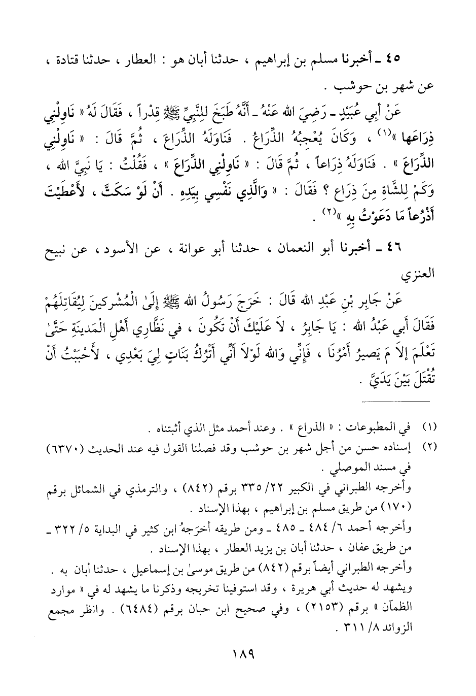 45 - أَخْبَرَنَا مُسْلِمُ بْنُ إِبْرَاهِيمَ، حَدَّثَنَا أَبَانُ هُوَ الْعَطَّارُ، حَدَّثَنَا قَتَادَةُ، عَنْ شَهْرِ بْنِ حَوْشَبٍ، عَنْ أَبِي عُبَيْدٍ رَضِيَ اللَّهُ عَنْهُ أَنَّهُ طَبَخَ لِلنَّبِيِّ صَلَّى اللهُ عَلَيْهِ وَسَلَّمَ قِدْرًا، فَقَالَ لَهُ «نَاوِلْنِي ذِرَاعَهَا»، وَكَانَ يُعْجِبُهُ الذِّرَاعُ، فَنَاوَلَهُ الذِّرَاعَ، ثُمَّ قَالَ: «نَاوِلْنِي الذِّرَاعَ»، فَنَاوَلَهُ ذِرَاعًا، ثُمَّ قَالَ: «نَاوِلْنِي الذِّرَاعَ»، فَقُلْتُ: يَا نَبِيَّ اللَّهِ، وَكَمْ لِلشَّاةِ مِنْ ذِرَاعٍ؟ فَقَالَ: «وَالَّذِي نَفْسِي بِيَدِهِ، أَنْ §لَوْ سَكَتَّ، لَأُعْطِيتُ أَذْرُعًا مَا دَعَوْتُ بِهِ» Qإسناده حسن من أجل شهر بن حوشب