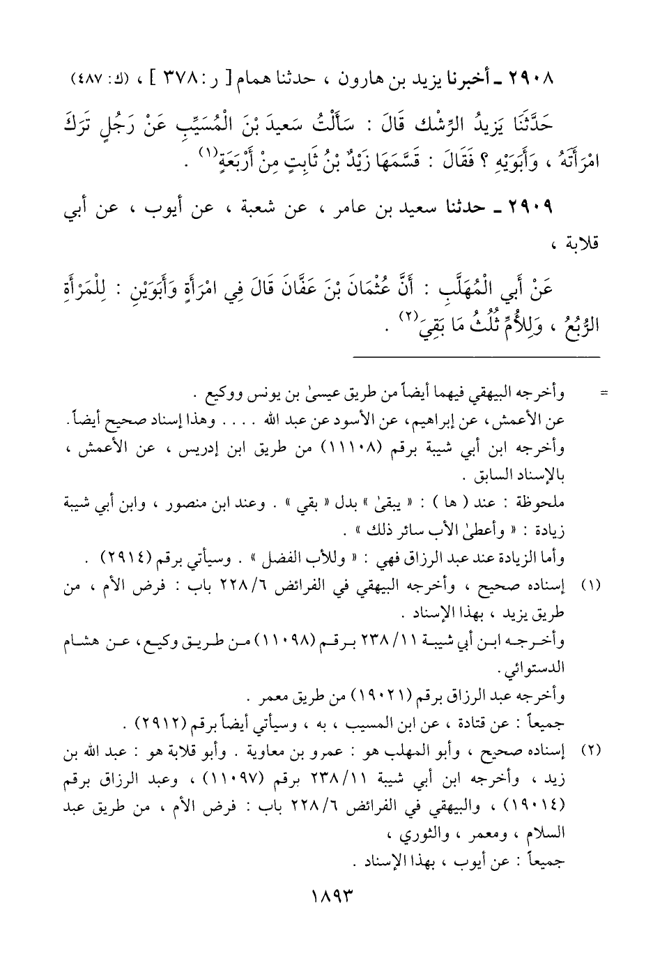 2908 - أَخْبَرَنَا يَزِيدُ بْنُ هَارُونَ، حَدَّثَنَا هَمَّامٌ، حَدَّثَنَا يَزِيدُ الرِّشْكُ، قَالَ: سَأَلْتُ سَعِيدَ بْنَ الْمُسَيِّبِ، عَنْ رَجُلٍ تَرَكَ امْرَأَتَهُ، وَأَبَوَيْهِ؟ فَقَالَ: «§قَسَّمَهَا زَيْدُ بْنُ ثَابِتٍ، مِنْ أَرْبَعَةٍ» Qإسناده صحيح
