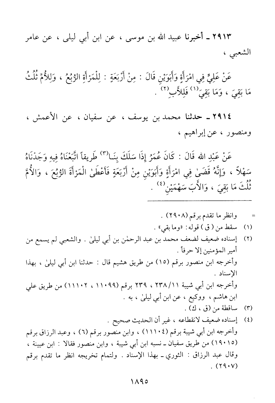 2913 - أَخْبَرَنَا عُبَيْدُ اللَّهِ بْنُ مُوسَى، عَنْ ابْنِ أَبِي لَيْلَى، عَنْ عَامِرٍ الشَّعْبِيِّ، عَنْ عَلِيٍّ، §فِي امْرَأَةٍ وَأَبَوَيْنِ قَالَ: " مِنْ أَرْبَعَةٍ: لِلْمَرْأَةِ الرُّبُعُ، وَلِلْأُمِّ ثُلُثُ مَا بَقِيَ، وَمَا بَقِيَ فَلِلْأَبِ "Qإسناده ضعيف لضعف محمد بن عبد الرحمن بن أبي ليلى