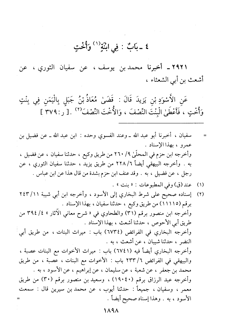 2921 - أَخْبَرَنَا مُحَمَّدُ بْنُ يُوسُفَ، عَنْ سُفْيَانَ الثَّوْرِيِّ، عَنْ أَشْعَثَ بْنِ أَبِي الشَّعْثَاءِ، عَنْ الْأَسْوَدِ بْنِ يَزِيدَ، قَالَ: «قَضَى مُعَاذُ بْنُ جَبَلٍ، بِالْيَمَنِ §فِي بِنْتٍ وَأُخْتٍ، فَأَعْطَى الْبِنْتَ النِّصْفَ، وَالْأُخْتَ النِّصْفَ» Qإسناده صحيح على شرط البخاري إلى الأسود