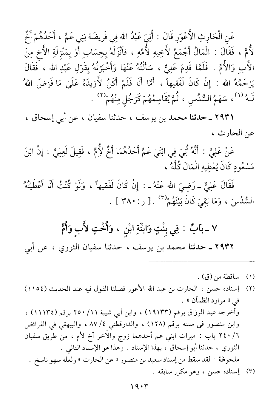 2931 - حَدَّثَنَا مُحَمَّدُ بْنُ يُوسُفَ، حَدَّثَنَا سُفْيَانُ، عَنْ أَبِي إِسْحَاقَ، عَنْ الْحَارِثِ، عَنْ عَلِيٍّ، أَنَّهُ أُتِيَ فِي ابْنَيْ عَمٍّ أَحَدُهُمَا أَخٌ لِأُمٍّ، فَقِيلَ لِعَلِيٍّ: إِنَّ ابْنَ مَسْعُودٍ، كَانَ يُعْطِيهِ الْمَالَ كُلَّهُ، فَقَالَ عَلِيٌّ رَضِيَ اللَّهُ عَنْهُ: «إِنْ كَانَ لَفَقِيهًا، وَلَوْ كُنْتُ أَنَا §أَعْطَيْتُهُ السُّدُسَ، وَمَا بَقِيَ كَانَ بَيْنَهُمْ» Qإسناده حسن وهو مكرر سابقه
