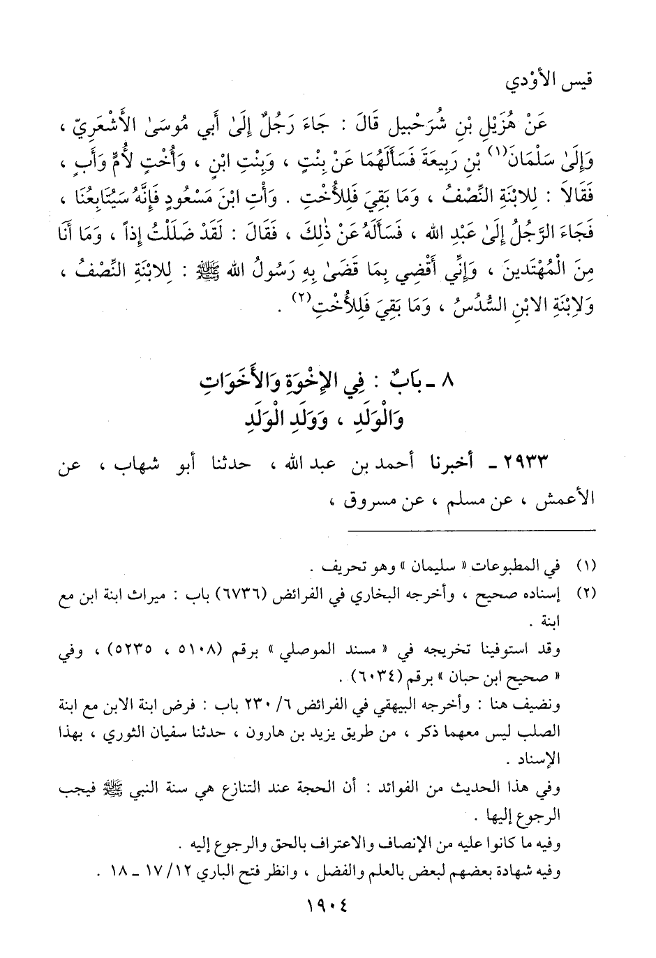 2933 - أَخْبَرَنَا أَحْمَدُ بْنُ عَبْدِ اللَّهِ، حَدَّثَنَا أَبُو شِهَابٍ، عَنْ الْأَعْمَشِ، عَنْ مُسْلِمٍ، عَنْ مَسْرُوقٍ، -[1905]- عَنْ عَبْدِ اللَّهِ، أَنَّهُ كَانَ يَقُولُ §فِي أَخَوَاتٍ لِأَبٍ وَأُمٍّ، وَإِخْوَةٍ وَأَخَوَاتٍ لِأَبٍ، لِلْأَخَوَاتِ لِلْأَبِ وَالْأُمِّ الثُّلُثَانِ، وَمَا بَقِيَ فَلِلذُّكُورِ دُونَ الْإِنَاثِ " فَقَدِمَ مَسْرُوقٌ الْمَدِينَةَ، فَسَمِعَ قَوْلَ زَيْدٍ، فِيهَا فَأَعْجَبَهُ، فَقَالَ لَهُ بَعْضُ أَصْحَابِهِ: أَتَتْرُكُ قَوْلَ عَبْدِ اللَّهِ؟ قَالَ: إِنِّي أَتَيْتُ الْمَدِينَةَ فَوَجَدْتُ زَيْدَ بْنَ ثَابِتٍ مِنَ الرَّاسِخِينَ فِي الْعِلْمِ قَالَ أَحْمَدُ: فَقُلْتُ لِأَبِي شِهَابٍ: وَكَيْفَ قَالَ زَيْدٌ فِيهَا؟ قَالَ: «شَرَّكَ بَيْنَهُمْ» Qإسناده صحيح وأحمد بن عبد الله هو: ابن يونس. وأبو شهاب: هو عبد ربه بن نافع