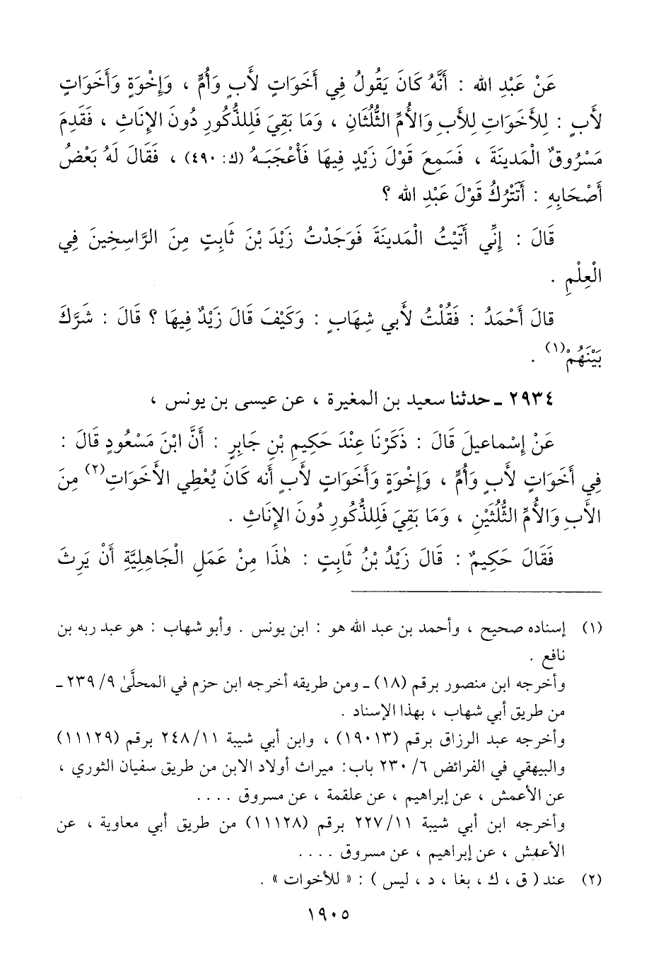 2934 - حَدَّثَنَا سَعِيدُ بْنُ الْمُغِيرَةِ، عَنْ عِيسَى بْنِ يُونُسَ، عَنْ إِسْمَاعِيلَ، قَالَ: ذَكَرْنَا عِنْدَ حَكِيمِ بْنِ جَابِرٍ: أَنَّ ابْنَ مَسْعُودٍ، قَالَ فِي أَخَوَاتٍ لِأَبٍ وَأُمٍّ، وَإِخْوَةٍ وَأَخَوَاتٍ لِأَبٍ: «أَنَّهُ كَانَ §يُعْطِي الْأَخَوَاتِ مِنَ الْأَبِ وَالْأُمِّ الثُّلُثَيْنِ، وَمَا بَقِيَ فَلِلذُّكُورِ دُونَ الْإِنَاثِ» فَقَالَ حَكِيمٌ: قَالَ زَيْدُ بْنُ ثَابِتٍ: «هَذَا مِنْ عَمَلِ الْجَاهِلِيَّةِ أَنْ يَرِثَ -[1906]- الرِّجَالُ دُونَ النِّسَاءِ، إِنَّ إِخْوَتَهُنَّ قَدْ رُدُّوا عَلَيْهِنَّ» Qإسناده صحيح وأخرجه ابن أبي شيبة