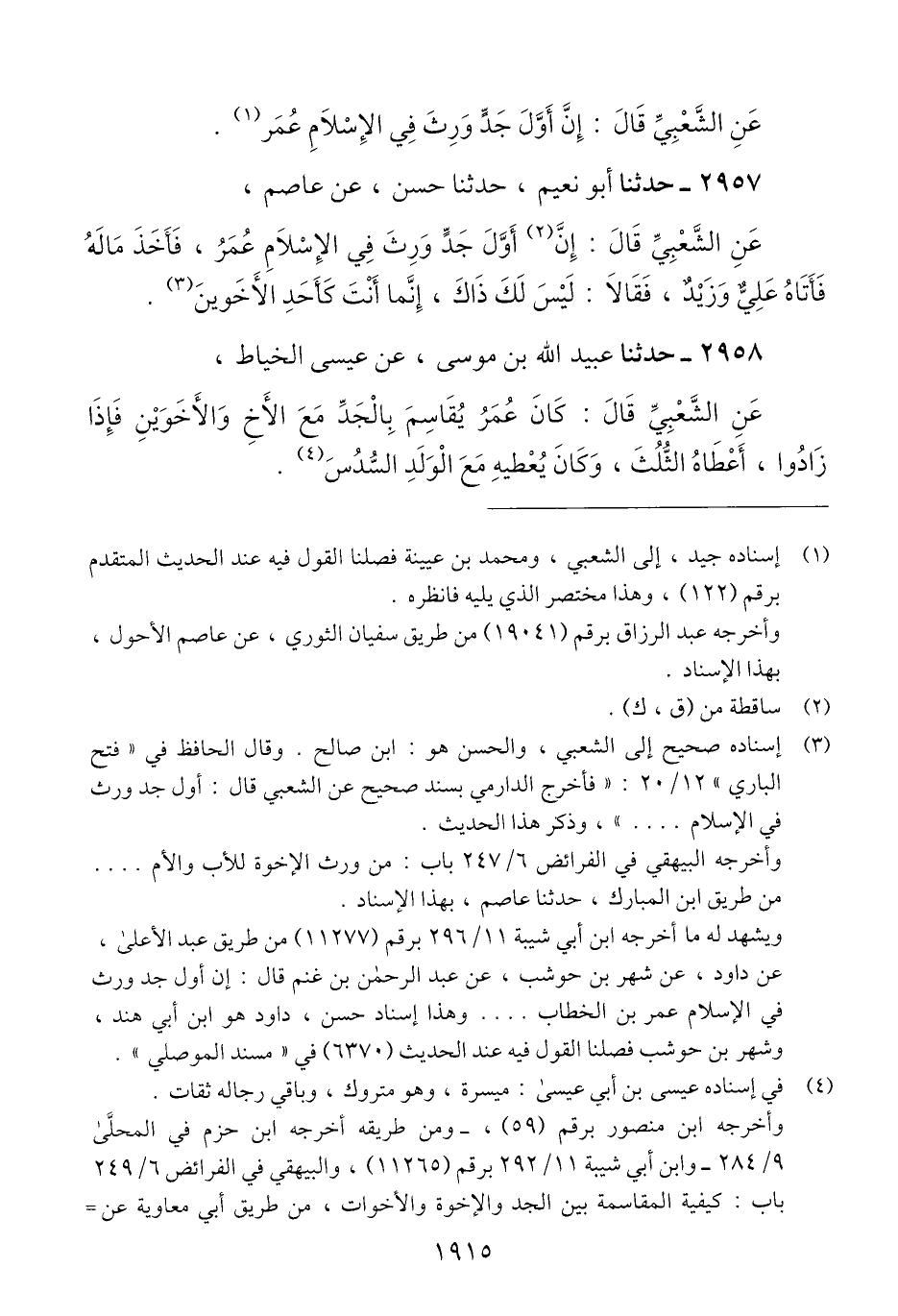 2957 - حَدَّثَنَا أَبُو نُعَيْمٍ، حَدَّثَنَا حَسَنٌ، عَنْ عَاصِمٍ، عَنْ الشَّعْبِيِّ، قَالَ: إِنَّ أَوَّلَ جَدٍّ وَرِثَ فِي الْإِسْلَامِ عُمَرُ، فَأَخَذَ مَالَهُ فَأَتَاهُ عَلِيٌّ وَزَيْدٌ، فَقَالَا: «§لَيْسَ لَكَ ذَاكَ، إِنَّمَا أَنْتَ كَأَحَدِ الْأَخَوَيْنِ» Qإسناده صحيح إلى الشعبي