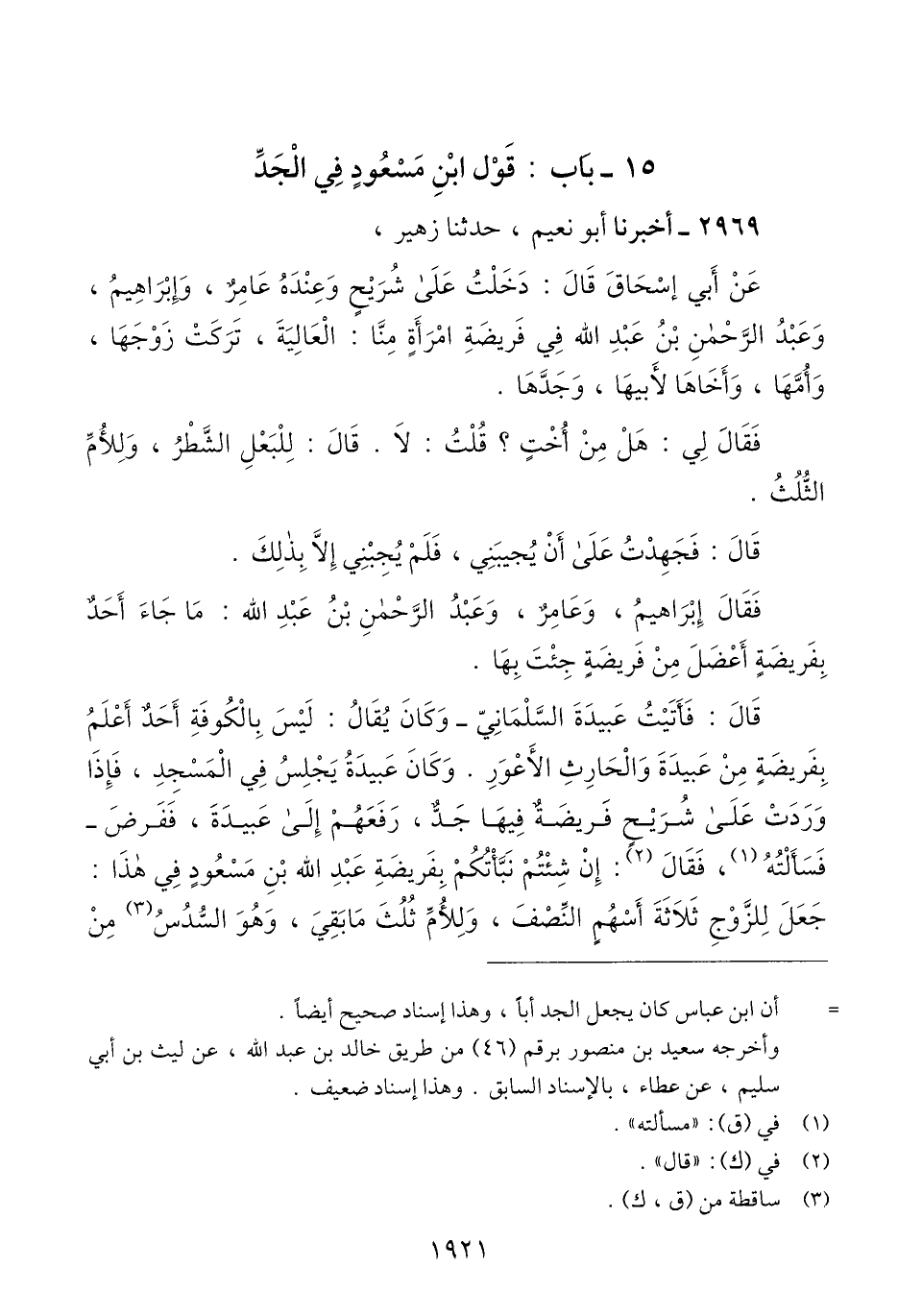 2969 - أَخْبَرَنَا أَبُو نُعَيْمٍ، حَدَّثَنَا زُهَيْرٌ، عَنْ أَبِي إِسْحَاقَ، قَالَ: دَخَلْتُ عَلَى شُرَيْحٍ، وَعِنْدَهُ عَامِرٌ، وَإِبْرَاهِيمُ، وَعَبْدُ الرَّحْمَنِ بْنُ عَبْدِ اللَّهِ فِي فَرِيضَةِ امْرَأَةٍ مِنَّا: الْعَالِيَةِ، تَرَكَتْ زَوْجَهَا، وَأُمَّهَا، وَأَخَاهَا لِأَبِيهَا، وَجَدَّهَا. فَقَالَ لِي: هَلْ مِنْ أُخْتٍ؟ قُلْتُ: لَا. قَالَ: لِلْبَعْلِ الشَّطْرُ، وَلِلْأُمِّ الثُّلُثُ. قَالَ: فَجَهِدْتُ عَلَى أَنْ يُجِيبَنِي، فَلَمْ يُجِبْنِي إِلَّا بِذَلِكَ. فَقَالَ إِبْرَاهِيمُ، وَعَامِرٌ، وَعَبْدُ الرَّحْمَنِ بْنُ عَبْدِ اللَّهِ: مَا جَاءَ أَحَدٌ بِفَرِيضَةٍ أَعْضَلَ مِنْ فَرِيضَةٍ جِئْتَ بِهَا. قَالَ: فَأَتَيْتُ عَبِيدَةَ السَّلْمَانِيَّ - وَكَانَ يُقَالُ: لَيْسَ بِالْكُوفَةِ أَحَدٌ أَعْلَمَ بِفَرِيضَةٍ مِنْ عَبِيدَةَ وَالْحَارِثِ الْأَعْوَرِ. وَكَانَ عَبِيدَةُ يَجْلِسُ فِي الْمَسْجِدِ، فَإِذَا وَرَدَتْ عَلَى شُرَيْحٍ فَرِيضَةٌ فِيهَا جَدٌّ، رَفَعَهُمْ إِلَى عَبِيدَةَ، فَفَرَضَ - فَسَأَلْتُهُ، فَقَالَ: إِنْ شِئْتُمْ نَبَّأْتُكُمْ بِفَرِيضَةِ عَبْدِ اللَّهِ بْنِ مَسْعُودٍ، فِي هَذَا: «§جَعَلَ لِلزَّوْجِ ثَلَاثَةَ أَسْهُمٍ النِّصْفَ، وَلِلْأُمِّ ثُلُثُ مَا بَقِيَ، السُّدُسُ مِنْ -[1922]- رَأْسِ الْمَالِ، وَلِلْأَخِ سَهْمٌ، وَلِلْجَدِّ سَهْمٌ» قَالَ أَبُو إِسْحَاقَ: «الْجَدُّ أَبُو الْأَبِ» Qإسناده صحيح إلى أبي إسحاق