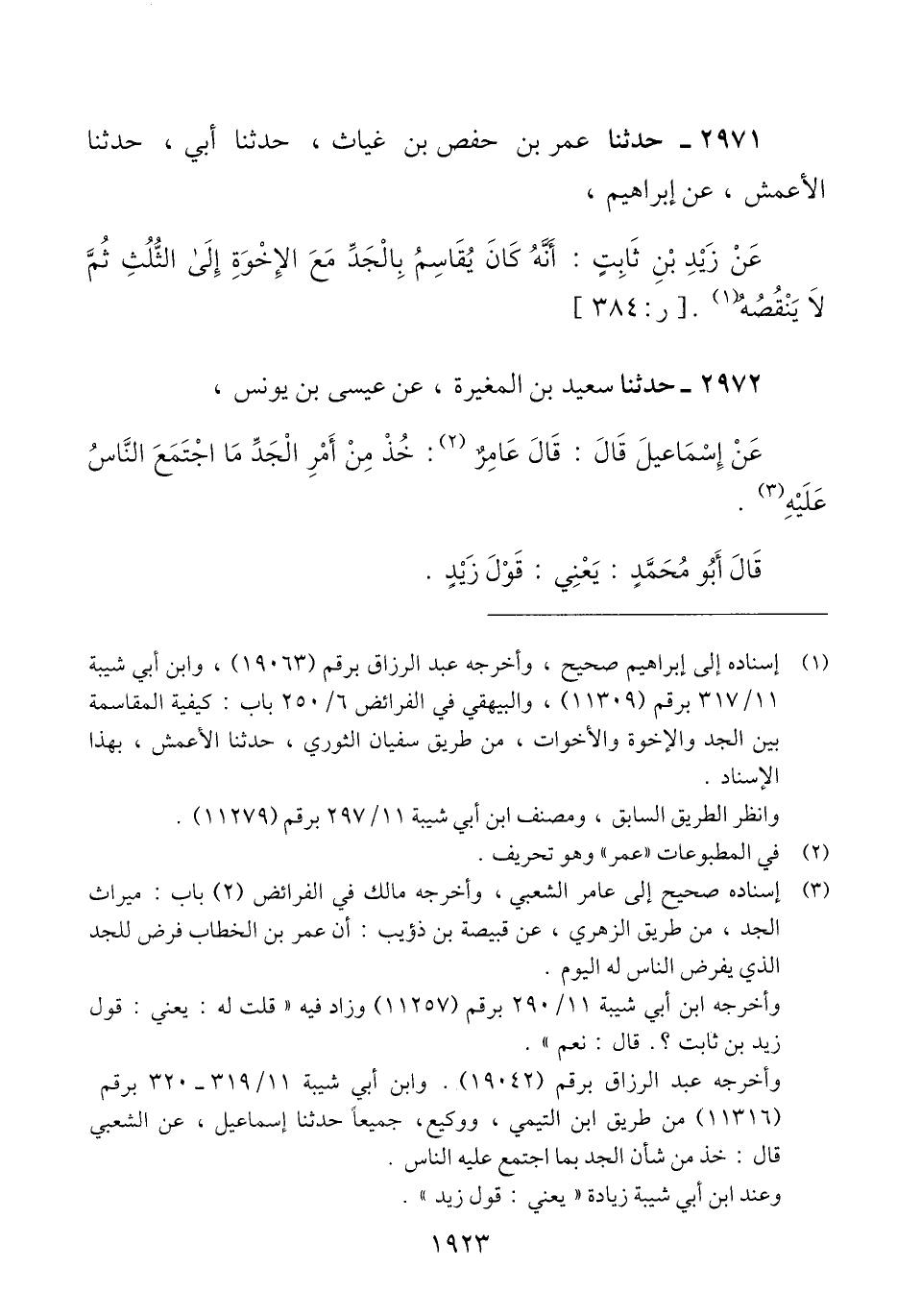 2971 - حَدَّثَنَا عُمَرُ بْنُ حَفْصِ بْنِ غِيَاثٍ، حَدَّثَنَا أَبِي، حَدَّثَنَا الْأَعْمَشُ، عَنْ إِبْرَاهِيمَ، عَنْ زَيْدِ بْنِ ثَابِتٍ «أَنَّهُ كَانَ §يُقَاسِمُ بِالْجَدِّ مَعَ الْإِخْوَةِ إِلَى الثُّلُثِ ثُمَّ لَا يُنْقِصُهُ» Qإسناده إلى إبراهيم صحيح