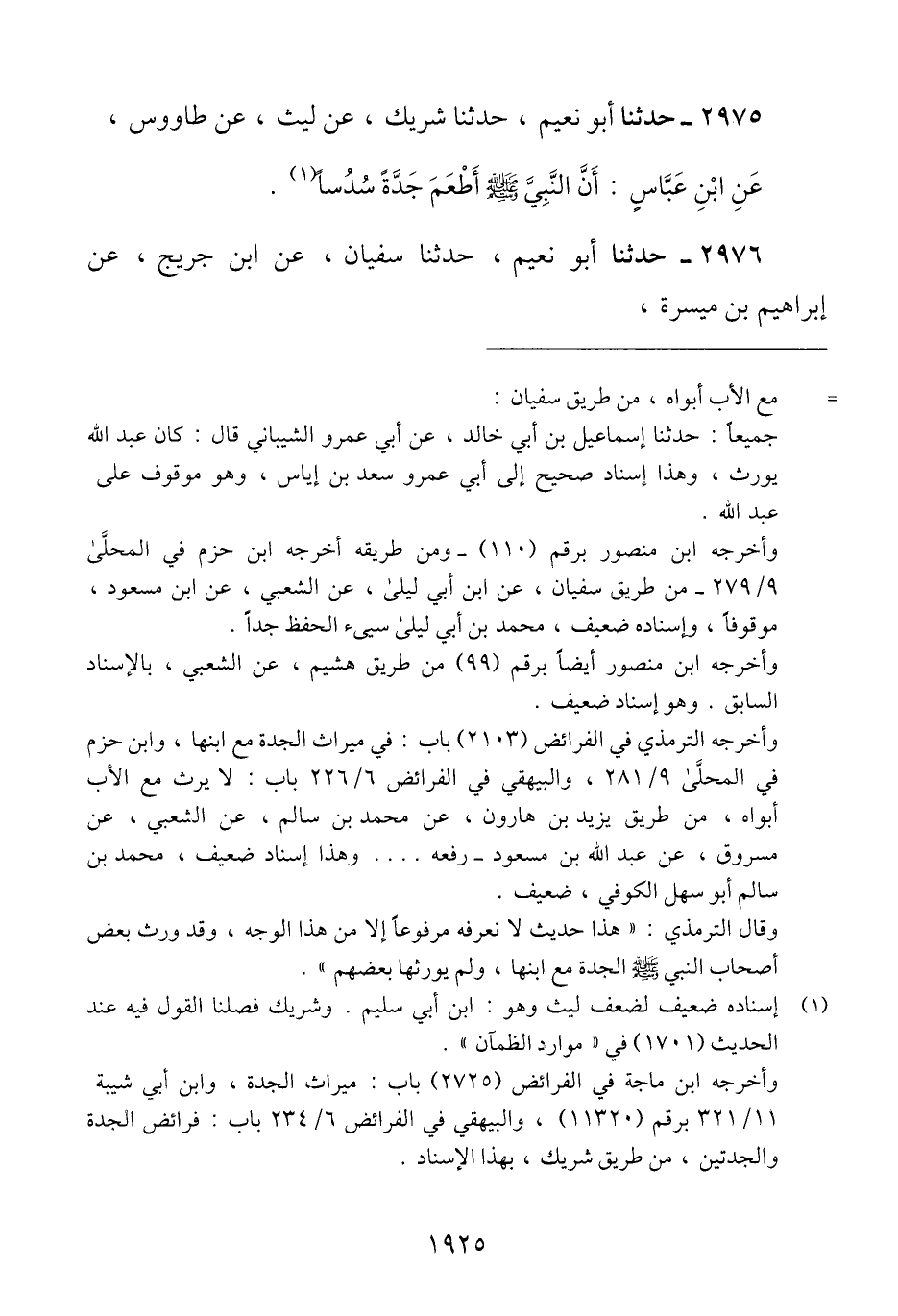 2975 - حَدَّثَنَا أَبُو نُعَيْمٍ، حَدَّثَنَا شَرِيكٌ، عَنْ لَيْثٍ، عَنْ طَاوُسٍ، عَنْ ابْنِ عَبَّاسٍ، أَنَّ النَّبِيَّ صَلَّى اللهُ عَلَيْهِ وَسَلَّمَ «§أَطْعَمَ جَدَّةً سُدُسًا» Qإسناده ضعيف لضعف ليث وهو: ابن أبي سليم