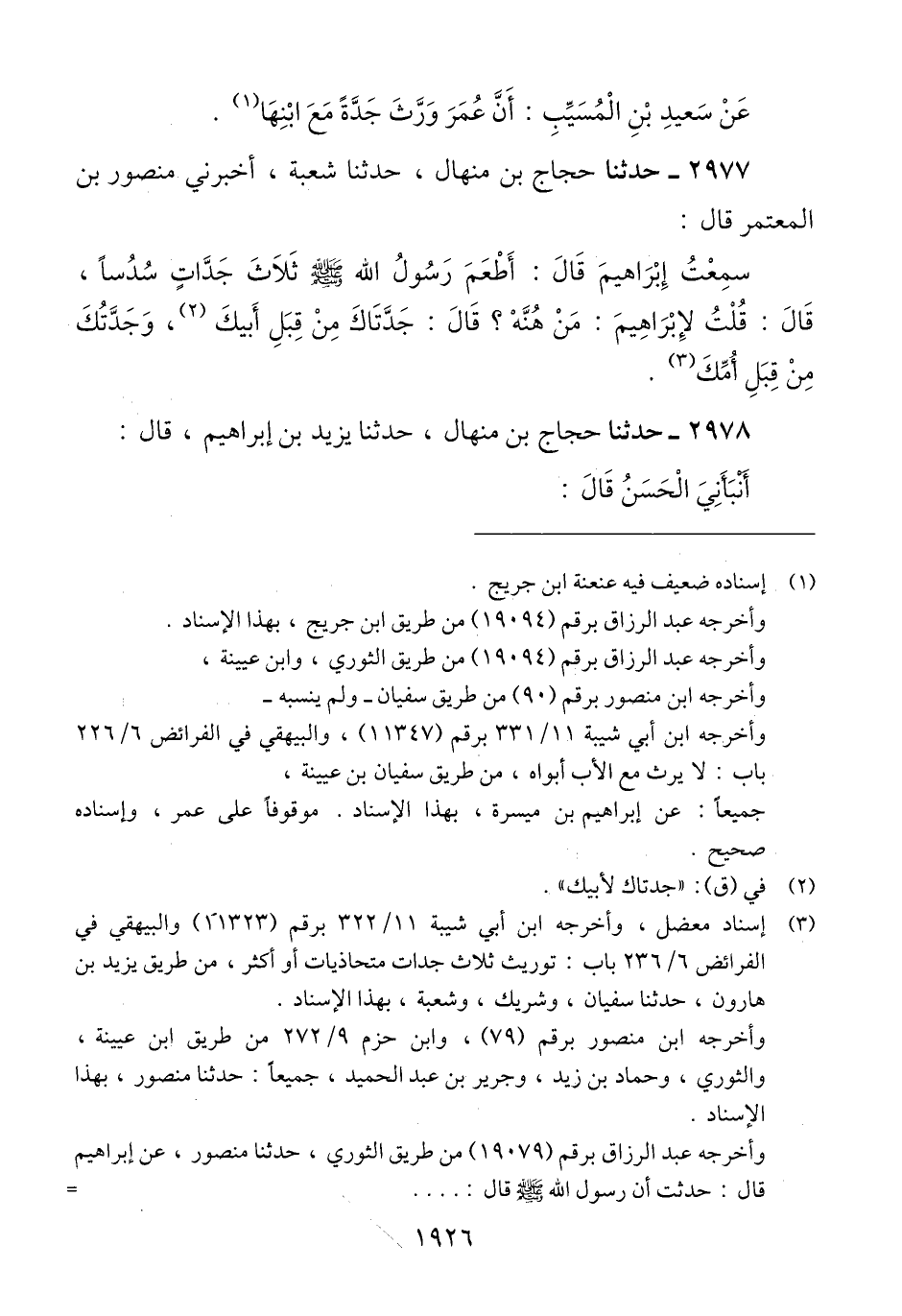 2977 - حَدَّثَنَا حَجَّاجُ بْنُ مِنْهَالٍ، حَدَّثَنَا شُعْبَةُ، أَخْبَرَنِي مَنْصُورُ بْنُ الْمُعْتَمِرِ، قَالَ: سَمِعْتُ إِبْرَاهِيمَ، قَالَ: «§أَطْعَمَ رَسُولُ اللَّهِ صَلَّى اللهُ عَلَيْهِ وَسَلَّمَ ثَلَاثَ جَدَّاتٍ سُدُسًا». قَالَ: قُلْتُ لِإِبْرَاهِيمَ: مَنْ هُنَّهْ؟ قَالَ: جَدَّتَاكَ مِنْ قِبَلِ أَبِيكَ، وَجَدَّتُكَ مِنْ قِبَلِ أُمِّكَQإسناد معضل