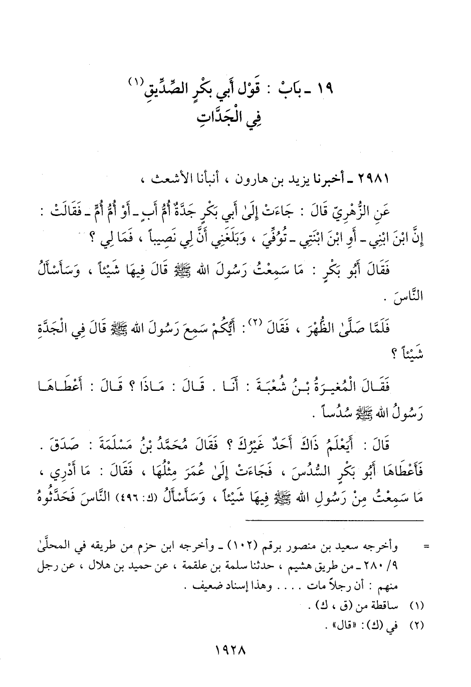 2981 - أَخْبَرَنَا يَزِيدُ بْنُ هَارُونَ، أَنْبَأَنَا الْأَشْعَثُ، عَنْ الزُّهْرِيِّ، قَالَ: جَاءَتْ إِلَى أَبِي بَكْرٍ جَدَّةٌ أُمُّ أَبٍ أَوْ أُمُّ أُمٍّ، فَقَالَتْ: إِنَّ ابْنَ ابْنِي أَوِ ابْنَ ابْنَتِي تُوُفِّيَ، وَبَلَغَنِي أَنَّ لِي نَصِيبًا، فَمَا لِي؟ فَقَالَ أَبُو بَكْرٍ: مَا سَمِعْتُ رَسُولَ اللَّهِ صَلَّى اللهُ عَلَيْهِ وَسَلَّمَ قَالَ فِيهَا شَيْئًا، وَسَأَسْأَلُ النَّاسَ. فَلَمَّا صَلَّى الظُّهْرَ، فقَالَ: أَيُّكُمْ سَمِعَ رَسُولَ اللَّهِ صَلَّى اللهُ عَلَيْهِ وَسَلَّمَ قَالَ فِي الْجَدَّةِ شَيْئًا؟ فَقَالَ الْمُغِيرَةُ بْنُ شُعْبَةَ: أَنَا. قَالَ: مَاذَا؟ قَالَ: «§أَعْطَاهَا رَسُولُ اللَّهِ صَلَّى اللهُ عَلَيْهِ وَسَلَّمَ سُدُسًا» قَالَ: أَيَعْلَمُ ذَاكَ أَحَدٌ غَيْرُكَ؟ فَقَالَ مُحَمَّدُ بْنُ مَسْلَمَةَ: صَدَقَ. فَأَعْطَاهَا أَبُو بَكْرٍ السُّدُسَ، فَجَاءَتْ إِلَى عُمَرَ، مِثْلُهَا فَقَالَ: مَا أَدْرِي، مَا سَمِعْتُ مِنْ رَسُولِ اللَّهِ صَلَّى اللهُ عَلَيْهِ وَسَلَّمَ فِيهَا شَيْئًا، وَسَأَسْأَلُ النَّاسَ فَحَدَّثُوهُ -[1929]- بِحَدِيثِ الْمُغِيرَةِ بْنِ شُعْبَةَ وَمُحَمَّدِ بْنِ مَسْلَمَةَ. فَقَالَ عُمَرُ: «أَيُّكُمَا خَلَتْ بِهِ، فَلَهَا السُّدُسُ، فَإِنِ اجْتَمَعْتُمَا فَهُوَ بَيْنَكُمَا» Qإسناده ضعيف