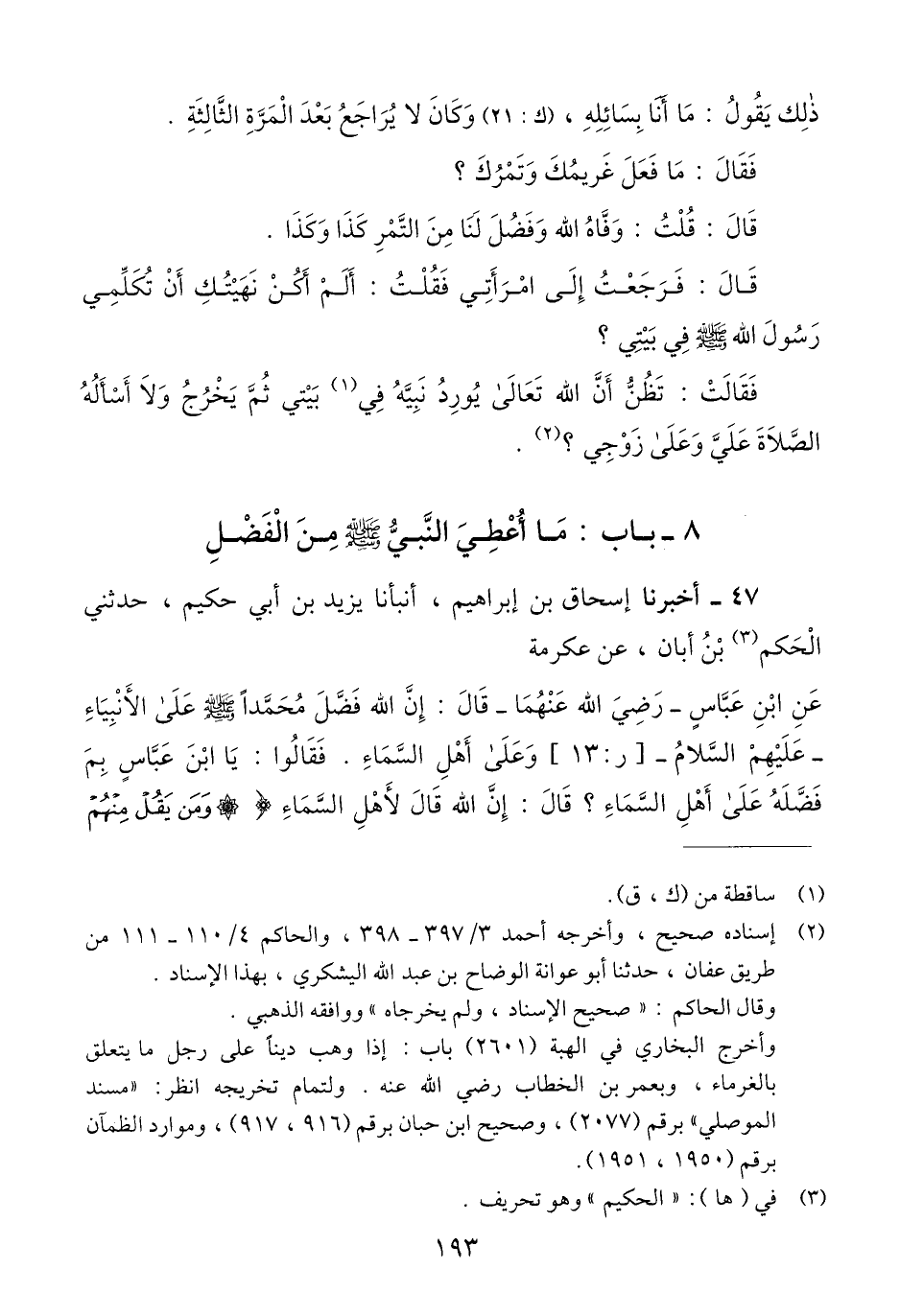 47 - أَخْبَرَنَا إِسْحَاقُ بْنُ إِبْرَاهِيمَ، أَنبأَنَا يَزِيدُ بْنُ أَبِي حَكِيمٍ، حَدَّثَنِي الْحَكَمُ بْنُ أَبَانَ، عَنْ عِكْرِمَةَ، عَنِ ابْنِ عَبَّاسٍ رَضِيَ اللَّهُ عَنْهُمَا، قَالَ: §إِنَّ اللَّهَ فَضَّلَ مُحَمَّدًا صَلَّى اللهُ عَلَيْهِ وَسَلَّمَ عَلَى الْأَنْبِيَاءِ عليهم السلام وَعَلَى أَهْلِ السَّمَاءِ، فَقَالُوا: يَا ابْنَ عَبَّاسٍ بِمَ فَضَّلَهُ عَلَى أَهْلِ السَّمَاءِ؟ قَالَ: إِنَّ اللَّهَ قَالَ لِأَهْلِ السَّمَاءِ {وَمَنْ يَقُلْ مِنْهُمْ -[194]- إِنِّي إِلَهٌ مِنْ دُونِهِ فَذَلِكَ نَجْزِيهِ جَهَنَّمَ كَذَلِكَ نَجْزِي الظَّالِمِينَ} [الأنبياء: 29]، الْآيَةَ. وَقَالَ اللَّهُ تَعَالَى لِمُحَمَّدٍ صَلَّى اللهُ عَلَيْهِ وَسَلَّمَ: {إِنَّا فَتَحْنَا لَكَ فَتْحًا مُبِينًا لِيَغْفِرَ لَكَ اللَّهُ مَا تَقَدَّمَ مِنْ ذَنْبِكَ وَمَا تَأَخَّرَ} [الفتح: 2] قَالُوا فَمَا فَضْلُهُ عَلَى الْأَنْبِيَاءِ عليهم السلام؟ قَالَ قَالَ: اللَّهُ عَزَّ وَجَلَّ: {وَمَا أَرْسَلْنَا مِنْ رَسُولٍ إِلَّا بِلِسَانِ قَوْمِهِ لِيُبَيِّنَ لَهُمْ} [إبراهيم: 4]، الْآيَةَ. وَقَالَ اللَّهُ عَزَّ وَجَلَّ لِمُحَمَّدٍ صَلَّى اللهُ عَلَيْهِ وَسَلَّمَ {وَمَا أَرْسَلْنَاكَ إِلَّا كَافَّةً لِلنَّاسِ} [سبأ: 28] فَأَرْسَلَهُ إِلَى الْجِنِّ وَالْإِنْسِQإسناده صحيح