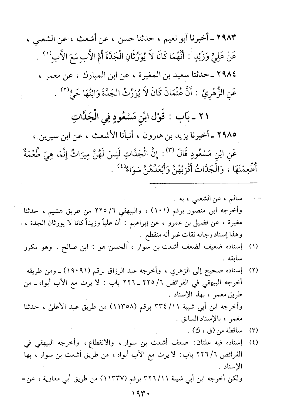 2985 - أَخْبَرَنَا يَزِيدُ بْنُ هَارُونَ، أَنْبَأَنَا الْأَشْعَثُ، عَنْ ابْنِ سِيرِينَ، عَنْ ابْنِ مَسْعُودٍ، قَالَ: «إِنَّ §الْجَدَّاتِ لَيْسَ لَهُنَّ مِيرَاثٌ إِنَّمَا هِيَ طُعْمَةٌ أُطْعِمْنَهَا، وَالْجَدَّاتُ أَقْرَبُهُنَّ وَأَبْعَدُهُنَّ سَوَاءٌ» Qإسناده فيه علتان: ضعف أشعث بن سوار والانقطاع