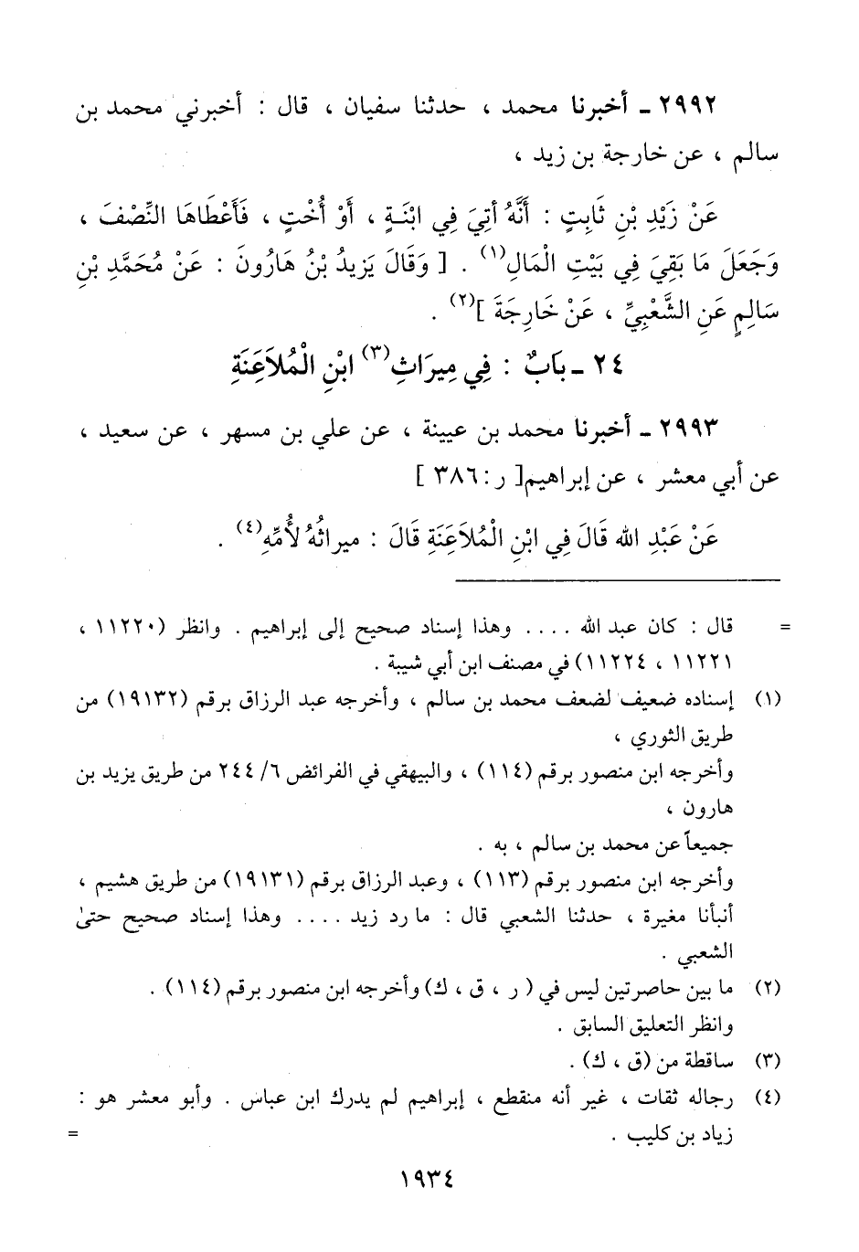 2992 - أَخْبَرَنَا مُحَمَّدٌ، حَدَّثَنَا سُفْيَانُ، قَالَ: أَخْبَرَنِي مُحَمَّدُ بْنُ سَالِمٍ، عَنْ خَارِجَةَ بْنِ زَيْدٍ، عَنْ زَيْدِ بْنِ ثَابِتٍ: «أَنَّهُ §أُتِيَ فِي ابْنَةٍ، أَوْ أُخْتٍ، فَأَعْطَاهَا النِّصْفَ، وَجَعَلَ مَا بَقِيَ فِي بَيْتِ الْمَالِ» وقَالَ يَزِيدُ بْنُ هَارُونَ: عَنْ مُحَمَّدِ بْنِ سَالِمٍ، عَنْ الشَّعْبِيِّ، عَنْ خَارِجَةَQإسناده ضعيف لضعف محمد بن سالم