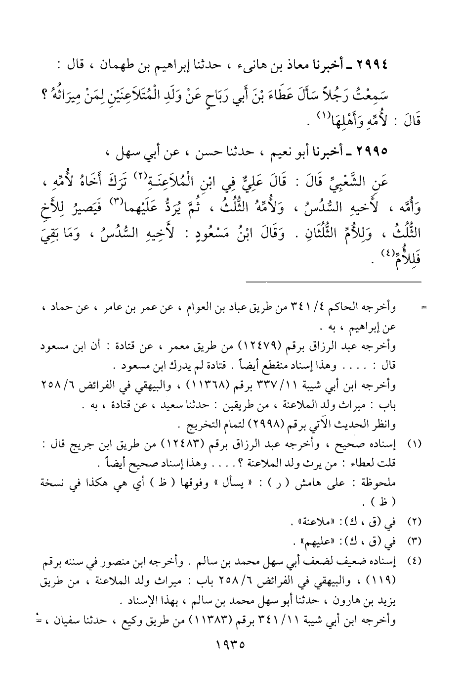 2995 - أَخْبَرَنَا أَبُو نُعَيْمٍ، حَدَّثَنَا حَسَنٌ، عَنْ أَبِي سَهْلٍ، عَنْ الشَّعْبِيِّ، قَالَ: قَالَ عَلِيٌّ، §فِي ابْنِ الْمُلَاعَنَةِ: «تَرَكَ أَخَاهُ لِأُمِّهِ، وَأُمَّهُ، لِأَخِيهِ السُّدُسُ، وَلِأُمِّهِ الثُّلُثُ، ثُمَّ يُرَدُّ عَلَيْهِمَا فَيَصِيرُ لِلْأَخِ الثُّلُثُ، وَلِلْأُمِّ الثُّلُثَانِ» وقَالَ ابْنُ مَسْعُودٍ: «لِأَخِيهِ السُّدُسُ، وَمَا بَقِيَ فَلِلْأُمِّ» Qإسناده ضعيف لضعف أبي سهل محمد بن سالم