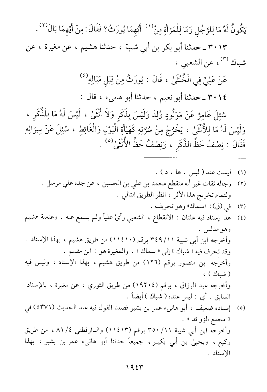 3013 - حَدَّثَنَا أَبُو بَكْرِ بْنُ أَبِي شَيْبَةَ، حَدَّثَنَا هُشَيْمٌ، عَنْ مُغِيرَةَ، عَنْ شِبَاكٍ، عَنْ الشَّعْبِيِّ، عَنْ عَلِيٍّ، §فِي الْخُنْثَى، قَالَ: «يُوَرَّثُ مِنْ قِبَلِ مَبَالِهِ»