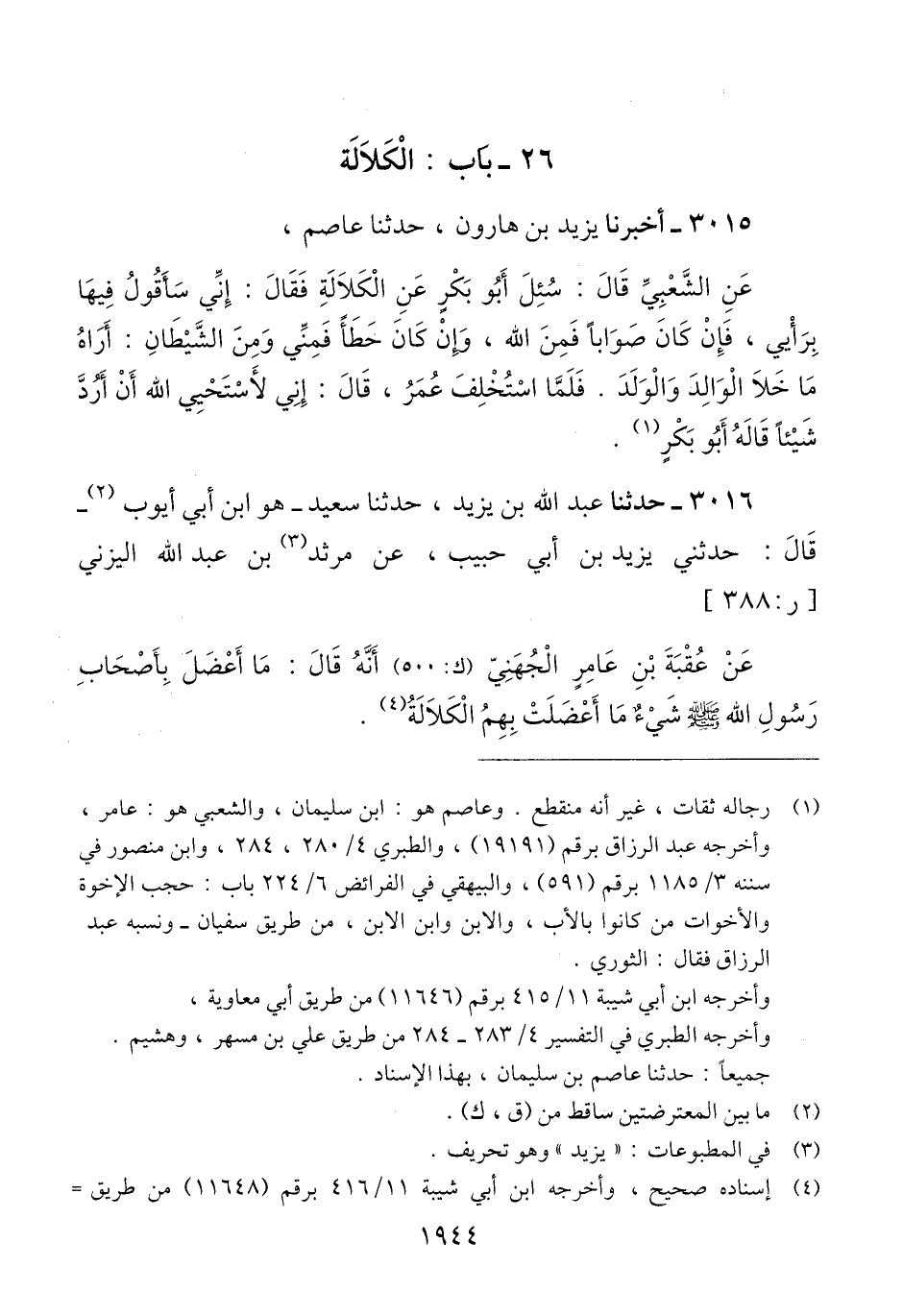 3016 - حَدَّثَنَا عَبْدُ اللَّهِ بْنُ يَزِيدَ، حَدَّثَنَا سَعِيدٌ هُوَ ابْنُ أَبِي أَيُّوبَ، قَالَ: حَدَّثَنِي يَزِيدُ بْنُ أَبِي حَبِيبٍ، عَنْ مَرْثَدِ بْنِ عَبْدِ اللَّهِ الْيَزَنِيِّ، عَنْ عُقْبَةَ بْنِ عَامِرٍ الْجُهَنِيِّ، أَنَّهُ قَالَ: «§مَا أَعْضَلَ بِأَصْحَابِ رَسُولِ اللَّهِ صَلَّى اللهُ عَلَيْهِ وَسَلَّمَ شَيْءٌ مَا أَعْضَلَتْ بِهِمُ الْكَلَالَةُ» Qإسناده صحيح
