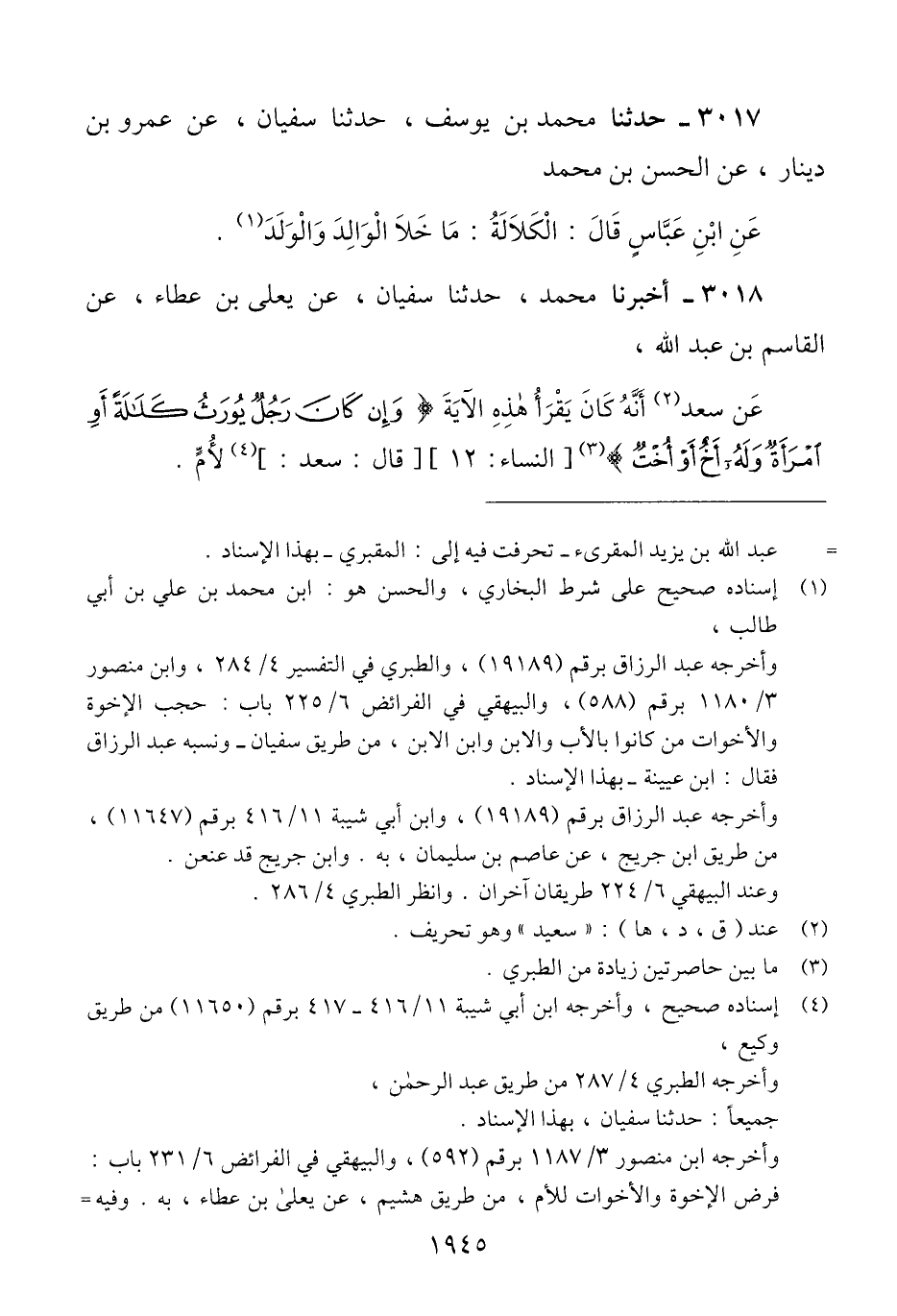 3017 - حَدَّثَنَا مُحَمَّدُ بْنُ يُوسُفَ، حَدَّثَنَا سُفْيَانُ، عَنْ عَمْرِو بْنِ دِينَارٍ، عَنْ الْحَسَنِ بْنِ مُحَمَّدٍ، عَنْ ابْنِ عَبَّاسٍ، قَالَ: " §الْكَلَالَةُ: مَا خَلَا الْوَالِدَ وَالْوَلَدَ "Qإسناده صحيح على شرط البخاري