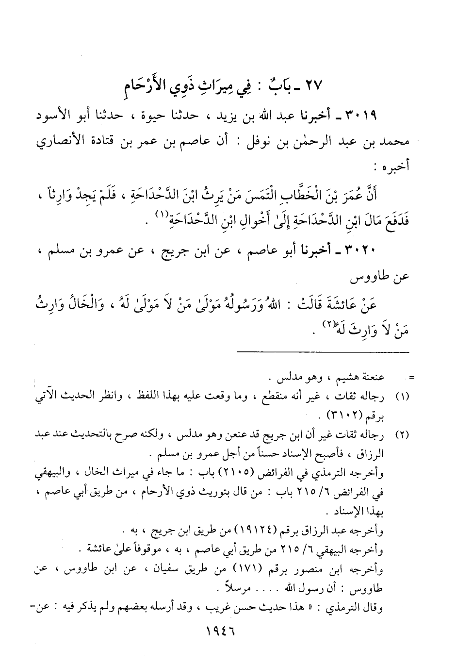 3019 - أَخْبَرَنَا عَبْدُ اللَّهِ بْنُ يَزِيدَ، حَدَّثَنَا حَيْوَةُ، حَدَّثَنَا أَبُو الْأَسْوَدِ مُحَمَّدُ بْنُ عَبْدِ الرَّحْمَنِ بْنِ نَوْفَلٍ، أَنَّ عَاصِمَ بْنَ عُمَرَ بْنِ قَتَادَةَ الْأَنْصَارِيَّ، أَخْبَرَهُ: «أَنَّ عُمَرَ بْنَ الْخَطَّابِ §الْتَمَسَ مَنْ يَرِثُ ابْنَ الدَّحْدَاحَةِ، فَلَمْ يَجِدْ وَارِثًا، فَدَفَعَ مَالَ ابْنِ الدَّحْدَاحَةِ إِلَى أَخْوَالِ ابْنِ الدَّحْدَاحَةِ» Qرجاله ثقات غير أنه منقطع