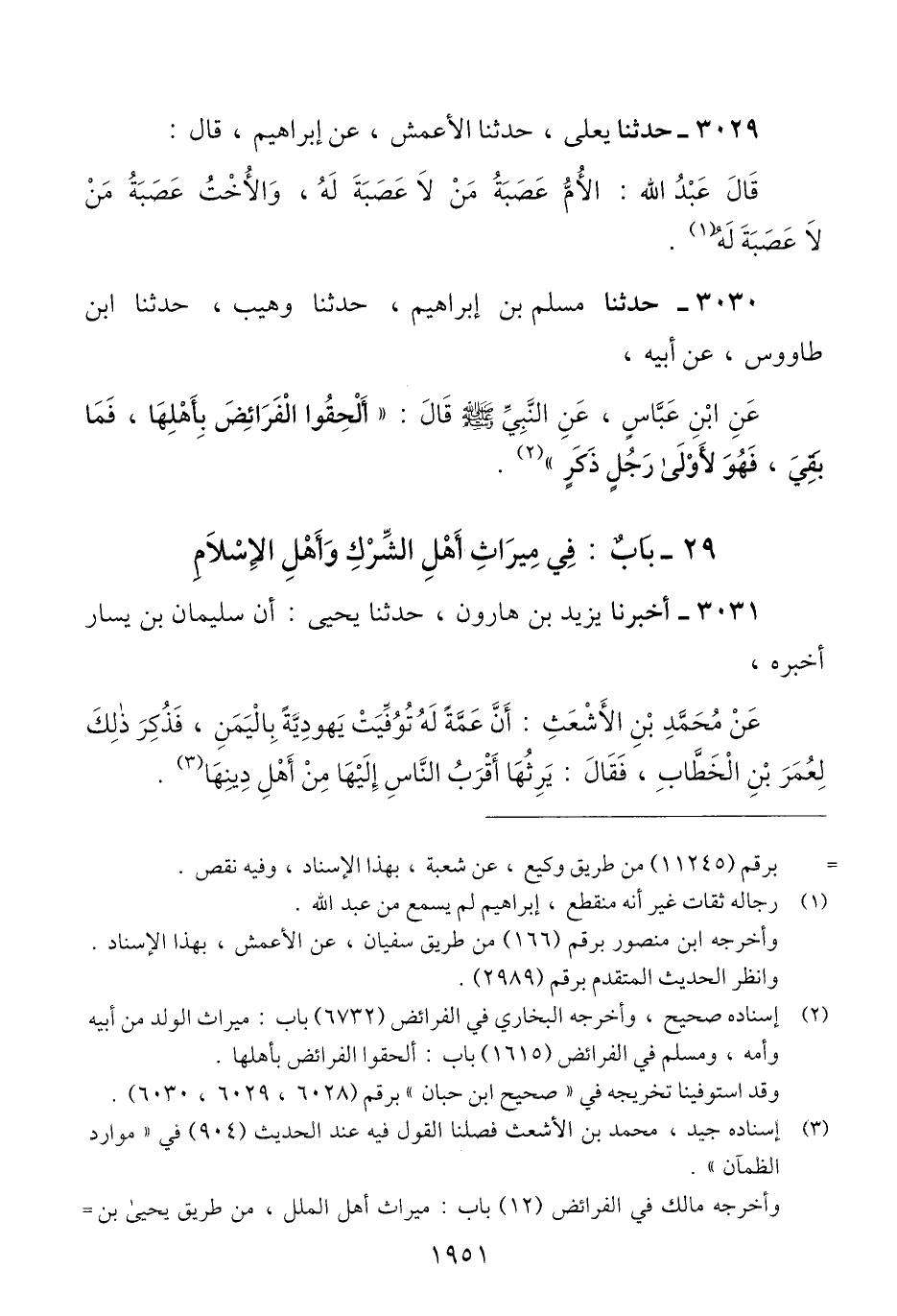3030 - حَدَّثَنَا مُسْلِمُ بْنُ إِبْرَاهِيمَ، حَدَّثَنَا وُهَيْبٌ، حَدَّثَنَا ابْنُ طَاوُسٍ، عَنْ أَبِيهِ، عَنْ ابْنِ عَبَّاسٍ، عَنِ النَّبِيِّ صَلَّى اللهُ عَلَيْهِ وَسَلَّمَ قَالَ: «§أَلْحِقُوا الْفَرَائِضَ بِأَهْلِهَا، فَمَا بَقِيَ، فَهُوَ لِأَوْلَى رَجُلٍ ذَكَرٍ» Qإسناده صحيح