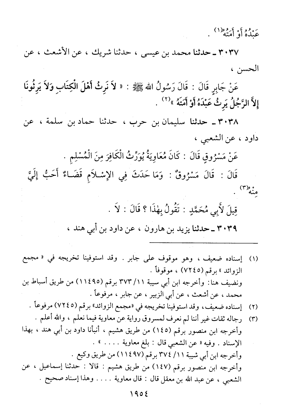 3038 - حَدَّثَنَا سُلَيْمَانُ بْنُ حَرْبٍ، حَدَّثَنَا حَمَّادُ بْنُ سَلَمَةَ، عَنْ دَاوُدَ، عَنْ الشَّعْبِيِّ، عَنْ مَسْرُوقٍ، قَالَ: «كَانَ مُعَاوِيَةُ، §يُوَرِّثُ الْمُسْلِمَ مِنَ الْكَافِرِ، وَلَا يُوَرِّثُ الْكَافِرَ مِنَ الْمُسْلِمِ» قَالَ: قَالَ مَسْرُوقٌ: «وَمَا حَدَثَ فِي الْإِسْلَامِ قَضَاءٌ أَحَبُّ إِلَيَّ مِنْهُ» قِيلَ لِأَبِي مُحَمَّدٍ: «تَقُولُ بِهَذَا؟» قَالَ: «لَا» Qرجاله ثقات غير أننا لم نعرف لمسروق رواية عن معاوية