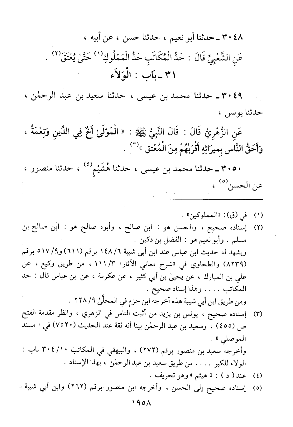3049 - حَدَّثَنَا مُحَمَّدُ بْنُ عِيسَى، حَدَّثَنَا سَعِيدُ بْنُ عَبْدِ الرَّحْمَنِ، حَدَّثَنَا يُونُسُ، عَنْ الزُّهْرِيِّ، قَالَ: قَالَ النَّبِيُّ صَلَّى اللهُ عَلَيْهِ وَسَلَّمَ: «§الْمَوْلَى أَخٌ فِي الدِّينِ، وَنِعْمَةٌ وَأَحَقُّ النَّاسِ بِمِيرَاثِهِ أَقْرَبُهُمْ مِنَ الْمُعْتِقِ» Qإسناده صحيح يونس بن يزيد من أثبت الناس في الزهري