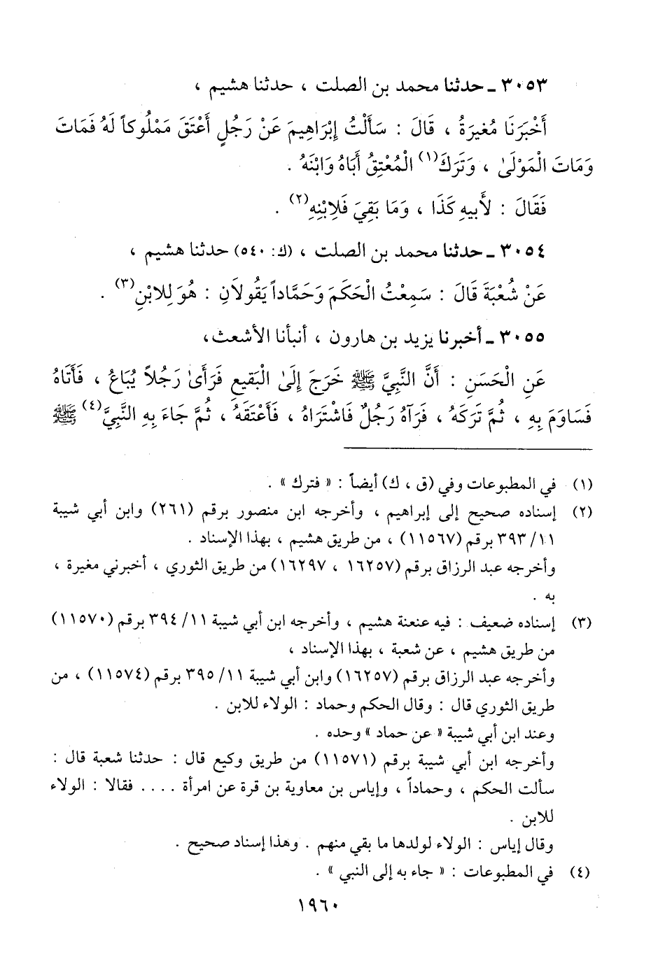 3053 - حَدَّثَنَا مُحَمَّدُ بْنُ الصَّلْتِ، حَدَّثَنَا هُشَيْمٌ، أَخْبَرَنَا مُغِيرَةُ، قَالَ: سَأَلْتُ إِبْرَاهِيمَ، عَنْ رَجُلٍ §أَعْتَقَ مَمْلُوكًا لَهُ فَمَاتَ وَمَاتَ الْمَوْلَى، وَتَرَكَ الْمُعْتِقُ أَبَاهُ وَابْنَهُ، فَقَالَ: «لِأَبِيهِ كَذَا، وَمَا بَقِيَ فَلِابْنِهِ» Qإسناده صحيح إلى إبراهيم