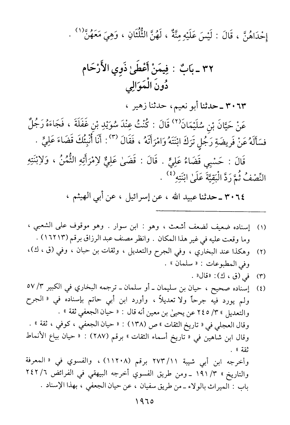 3063 - حَدَّثَنَا أَبُو نُعَيْمٍ، حَدَّثَنَا زُهَيْرٌ، عَنْ حَيَّانَ بْنِ سَلْمَانَ، قَالَ: كُنْتُ عِنْدَ سُوَيْدِ بْنِ غَفَلَةَ، فَجَاءَهُ رَجُلٌ فَسَأَلَهُ عَنْ فَرِيضَةِ رَجُلٍ تَرَكَ ابْنَتَهُ وَامْرَأَتَهُ، فقَالَ: أَنَا أُنْبِئُكَ قَضَاءَ عَلِيٍّ، قَالَ: حَسْبِي قَضَاءُ عَلِيٍّ، قَالَ: «قَضَى عَلِيٌّ، §لِامْرَأَتِهِ الثُّمُنَ، وَلِابْنَتِهِ النِّصْفَ ثُمَّ رَدَّ الْبَقِيَّةَ عَلَى ابْنَتِهِ» Qإسناده صحيح
