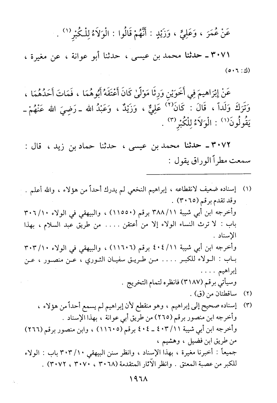 3071 - حَدَّثَنَا مُحَمَّدُ بْنُ عِيسَى، حَدَّثَنَا أَبُو عَوَانَةَ، عَنْ مُغِيرَةَ، عَنْ إِبْرَاهِيمَ، فِي أَخَوَيْنِ وَرِثَا مَوْلًى كَانَ أَعْتَقَهُ أَبُوهُمَا، فَمَاتَ أَحَدُهُمَا، وَتَرَكَ وَلَدًا، قَالَ: كَانَ عَلِيٌّ، وَزَيْدٌ، وَعَبْدُ اللَّهِ رَضِيَ اللَّهُ عَنْهُمْ، يَقُولُونَ: «§الْوَلَاءُ لِلْكُبْرِ» Qإسناده صحيح إلى إبراهيم وهو منقطع لأن إبراهيم لم يسمع أحدا من هؤلاء