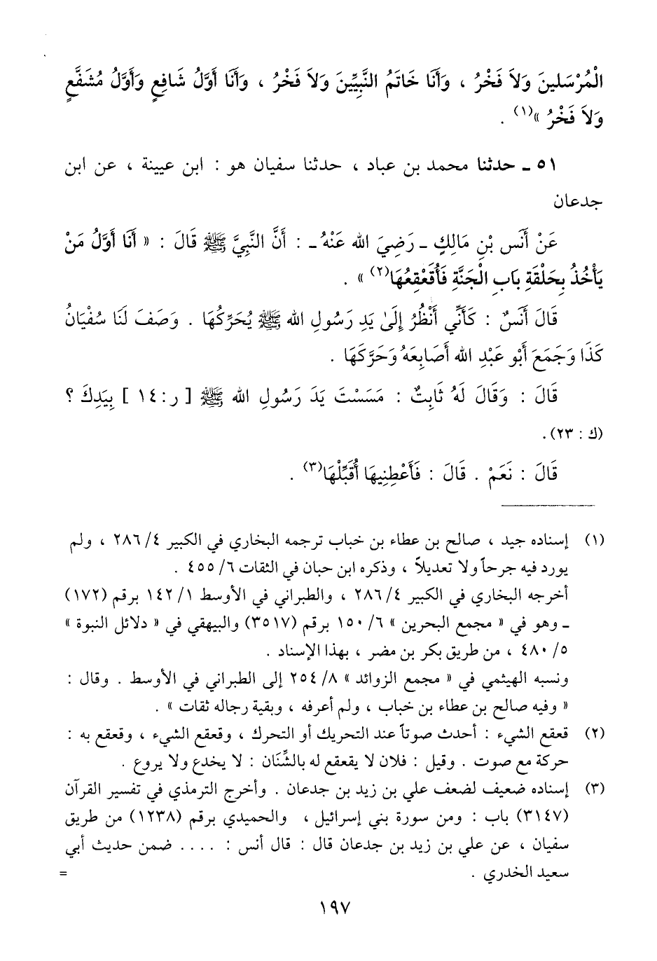 51 - حَدَّثَنَا مُحَمَّدُ بْنُ عَبَّادٍ، حَدَّثَنَا سُفْيَانُ هُوَ ابْنُ عُيَيْنَةَ، عَنِ ابْنِ جُدْعَانَ، عَنْ أَنَسِ بْنِ مَالِكٍ رَضِيَ اللَّهُ عَنْهُ أَنَّ النَّبِيَّ صَلَّى اللهُ عَلَيْهِ وَسَلَّمَ قَالَ: «§أَنَا أَوَّلُ مَنْ يَأْخُذُ بِحَلْقَةِ بَابِ الْجَنَّةِ فَأُقَعْقِعُهَا» قَالَ أَنَسٌ: كَأَنِّي أَنْظُرُ إِلَى يَدِ رَسُولِ اللَّهِ صَلَّى اللهُ عَلَيْهِ وَسَلَّمَ يُحَرِّكُهَا، وَصَفَ لَنَا سُفْيَانُ كَذَا وَجَمَعَ أَبُو عَبْدِ اللَّهِ أَصَابِعَهُ وَحَرَّكَهَا، قَالَ: وَقَالَ لَهُ ثَابِتٌ: مَسَسْتَ يَدَ رَسُولِ اللَّهِ صَلَّى اللهُ عَلَيْهِ وَسَلَّمَ بِيَدِكَ؟ قَالَ: نَعَمْ. قَالَ فَأَعْطِنِيهَا أُقَبِّلْهَاQإسناده ضعيف لضعف علي بن زيد بن جدعان
