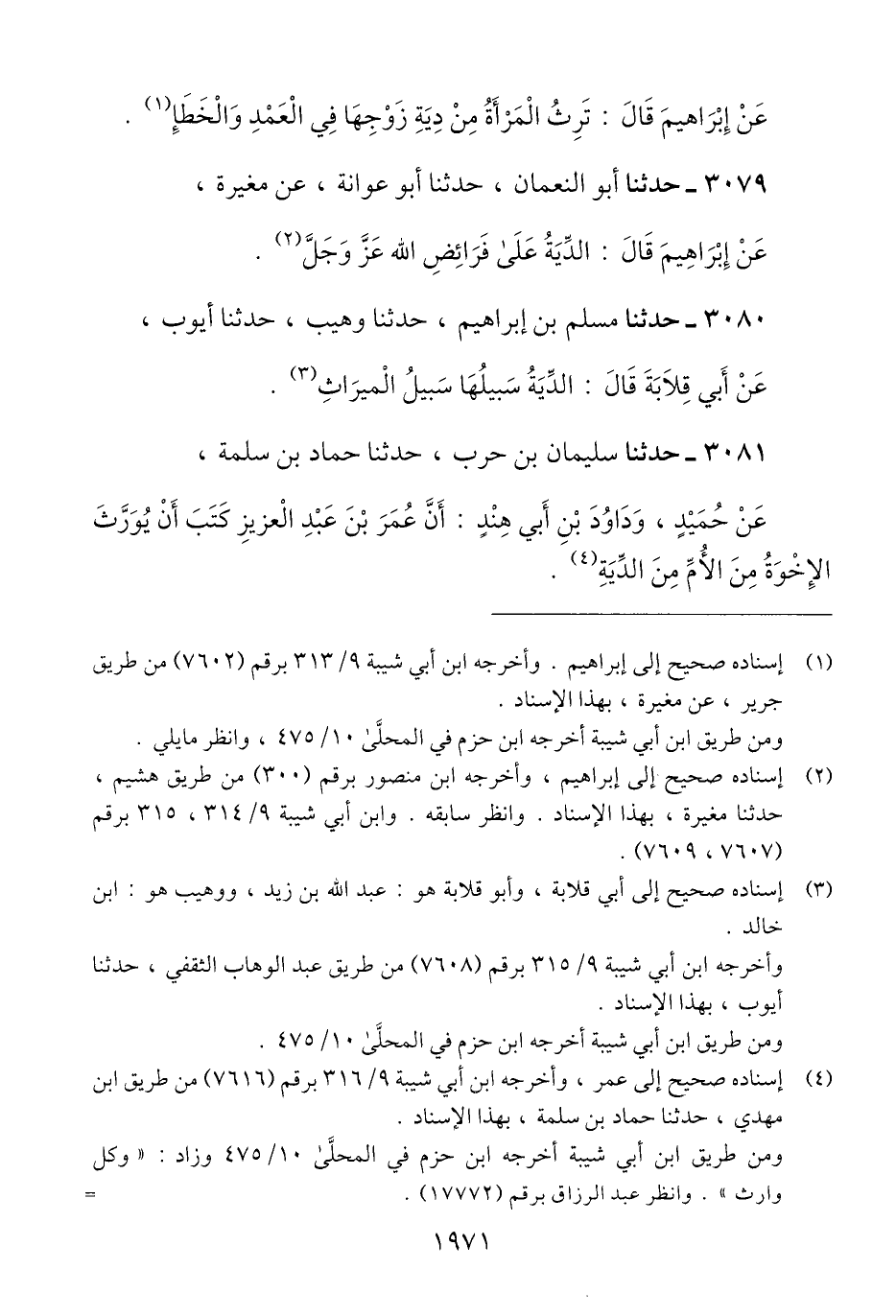 3080 - حَدَّثَنَا مُسْلِمُ بْنُ إِبْرَاهِيمَ، حَدَّثَنَا وُهَيْبٌ، حَدَّثَنَا أَيُّوبُ، عَنْ أَبِي قِلَابَةَ، قَالَ: «§الدِّيَةُ سَبِيلُهَا سَبِيلُ الْمِيرَاثِ» Qإسناده صحيح إلى أبي قلابة وأبو قلابة هو: عبد الله بن زيد